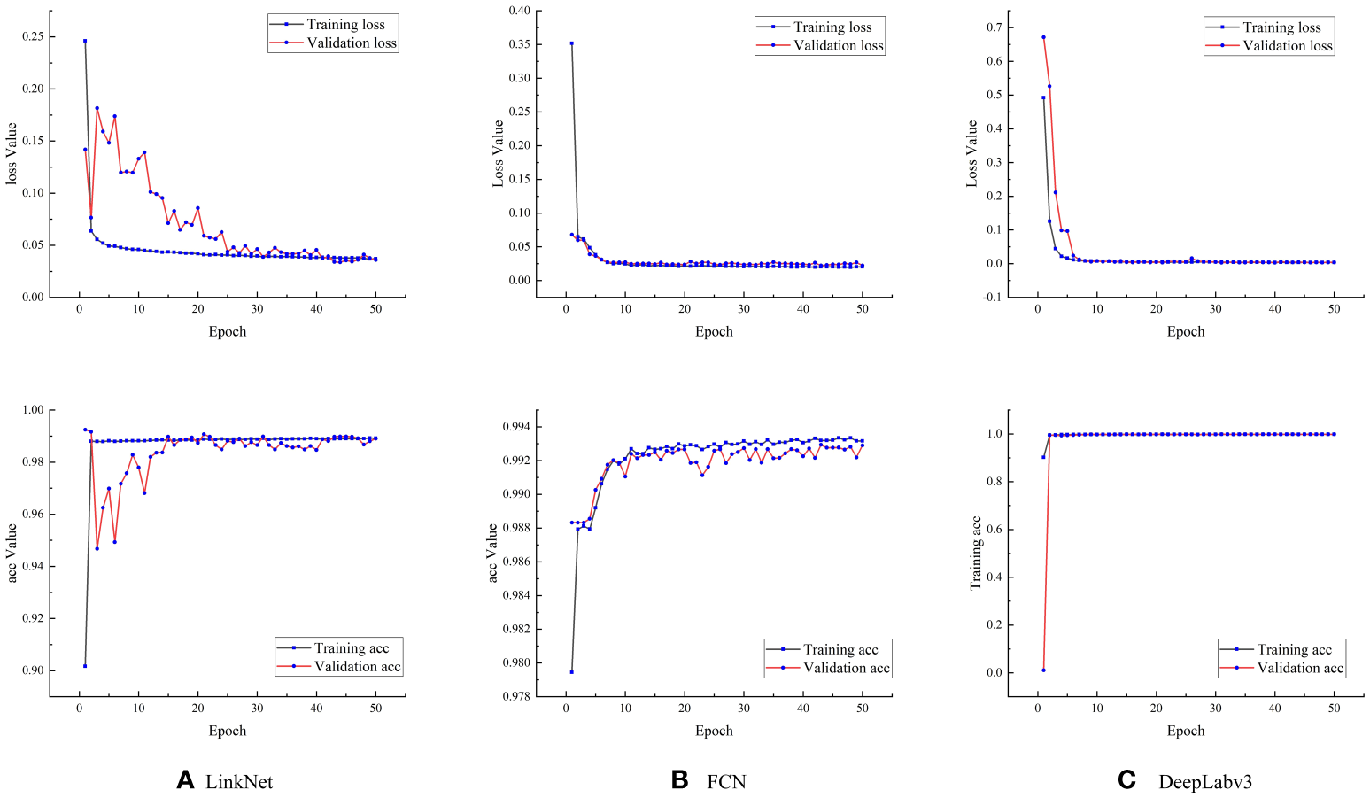 Loss values and accuracies of the three models. (A) Loss value and accuracy of the LinkNet model; (B) Loss value and accuracy of the FCN model; (C) Loss value and accuracy of the Deeplabv3 model.
