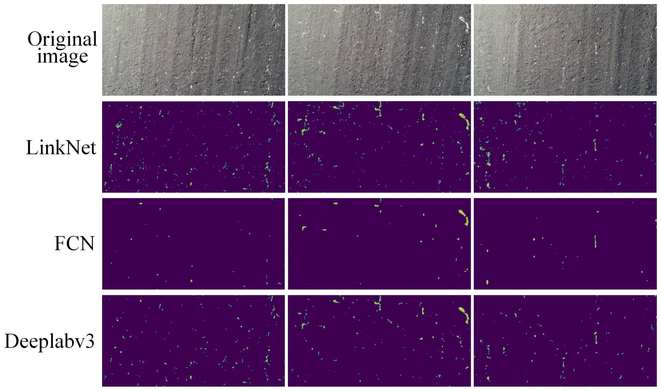 The segmentation results (image size is 5472 × 3078 pixels) predicted by the three models (LinkNet, FCN, and DeepLabv3) (Figure 10), showed that the segmentation performance of the three models were generally improved. The DeepLabv3 model had the best segmentation performance, followed by the FCN model, and the LinkNet model. The FCN model failed to identify many small areas of residual film. The LinkNet model had misidentification, and many small soil blocks were misidentified as residual film, resulting in the worst identification performance.