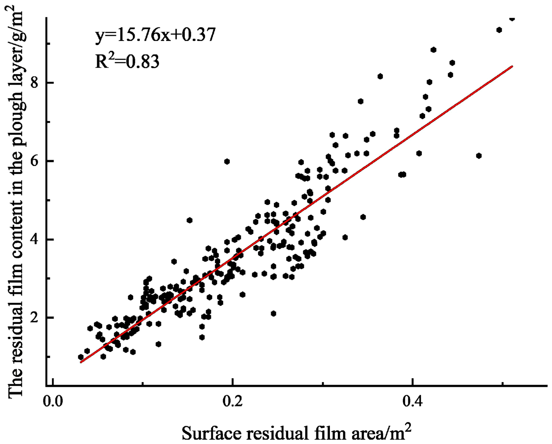 Figure 12 shows the analysis results obtained for the 250 sample data. The R2 was 0.83, and the root mean square error was 0.48. The mathematical expression y=15.76x+0.37 was obtained for the prediction of the residual film weight in the plough layer, where x is the area of the residual film on soil surface of the cotton field, and y is the weight of the residual film in the plough layer.