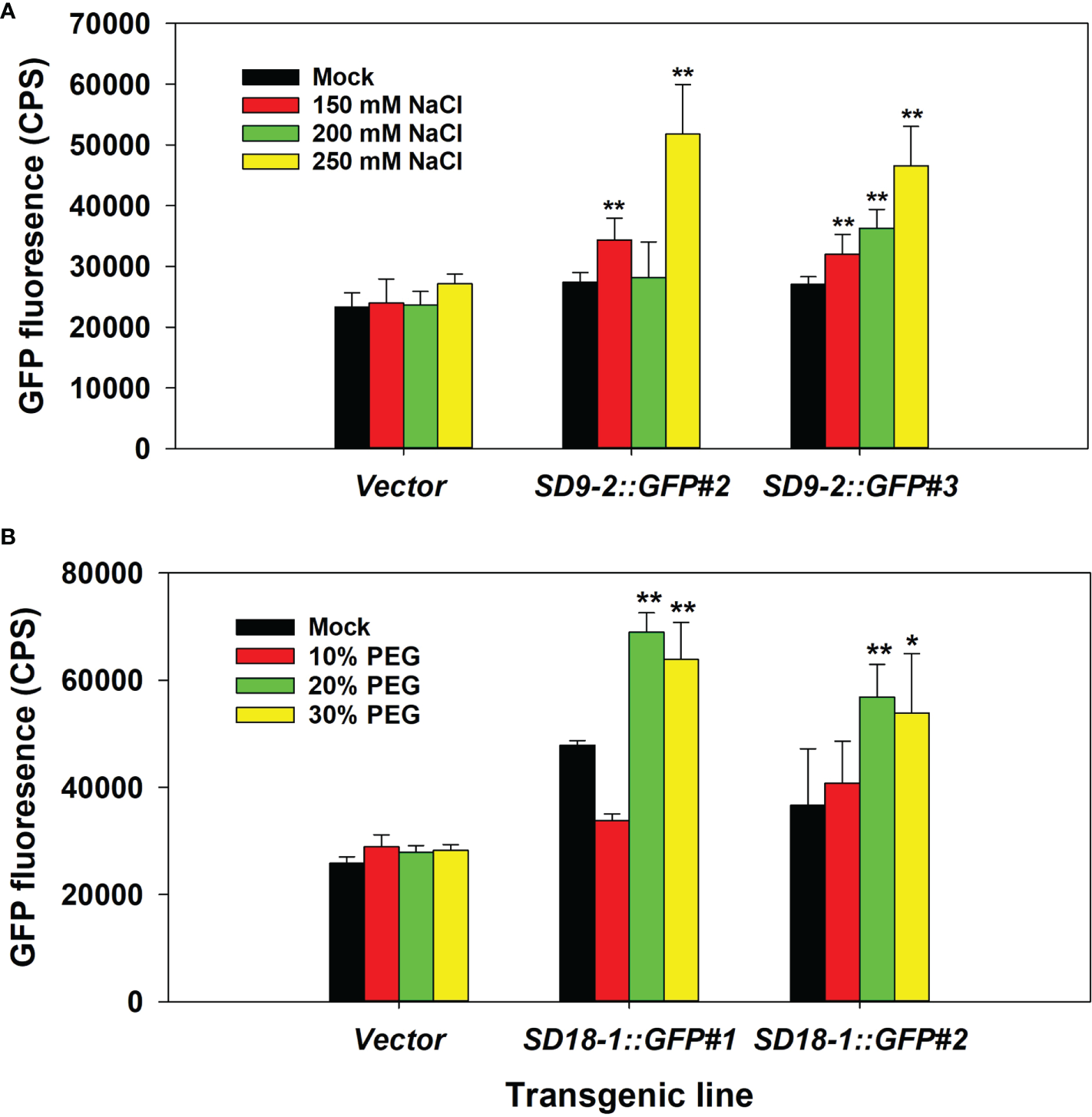 Determination of optimal NaCl and PEG treatment concentrations. The fifth to seventh positioned leaves of six-month-old ramets were used. (A) GFP fluorescence measurement after 150, 200, and 250 mM NaCl spray treatment for 3 days in counts per second (CPS). Vector control and two transgenic events of SD9-2:GFP as representative transgenic lines were tested. (B) GFP fluorescence measurement after 10, 20, and 30% PEG spray treatment for 3 days. Vector control and two transgenic events of SD18-1:GFP were used as representative transgenic lines. The bar shows the average of GFP intensity of the abaxial side of treated leaves (n=3). Asterisks denote significant difference of GFP expression between mock control and stress treated leaf via t-test (*P < 0.05, **P < 0.01).