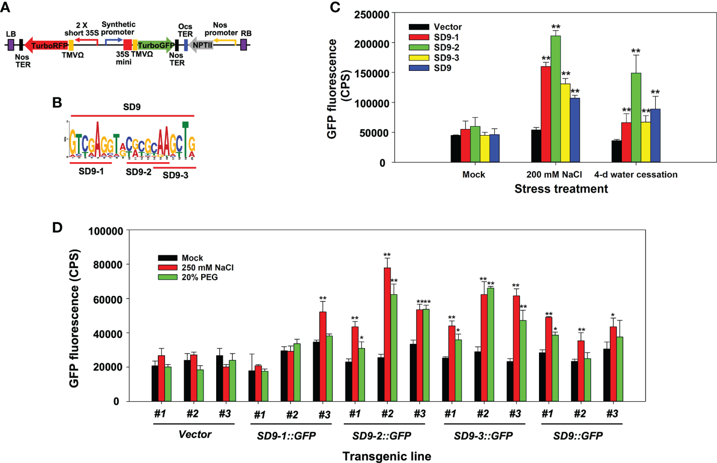 Stress induction of synthetic promoters consisting of heptamerized partial or full sequences from the SD9 motif. (A) Binary vector construct containing the synthetic promoter fused to TurboGFP. TurboRFP was driven by a 2 × short 35S constitutive promoter to monitor transformation. Heptamerized partial or full sequences from the SD9 motif (panel (B) were inserted into this backbone plasmid. (B) LOGO plot of full and partial DNA sequences of SD9. This sequence was heptamerized in working plasmids. (C) Transient expression analysis by agroinfiltration on N. benthamiana leaves. Each bar represents the average of GFP fluorescence measured by Fluorolog fluorescence spectrophotometry (n=3) in CPS. (D) Stress-inducible analysis of synthetic promoters consisting of heptamerized partial or full sequences from the SD9 motif in stable transgenic poplar. The GFP expression in the transgenic poplar leaves each carrying synthetic promoters in high salinity or drought-like conditions. For both tests, the leaves of six-month-old propagated clones were sprayed with 250 mM NaCl or 20% PEG for 3 days. Mock control was sprayed with DI water for the same period. The bar shows the average of GFP intensity of the abaxial side of treated leaves (n=3). In panel c and d, error bar represents standard deviation. The statistical significance of each value against vector control was determined by t-test (*P < 0.05, **P < 0.01).