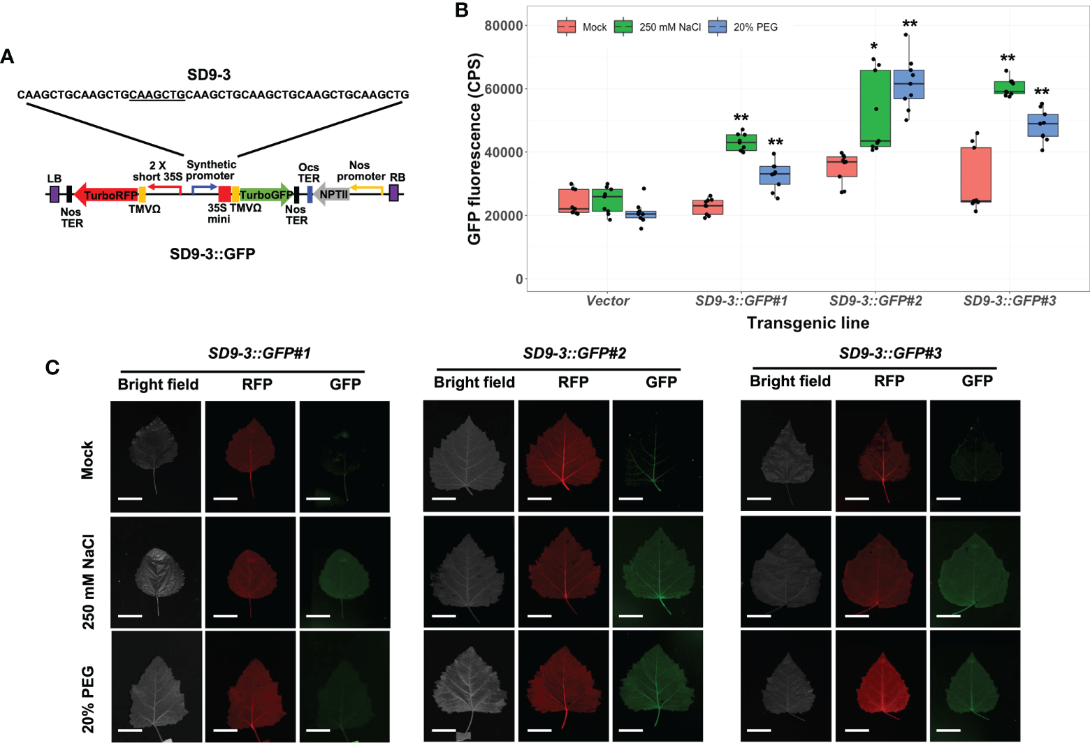 To verify the osmotic stress responsiveness of SD9-1, 9-2, and 9-3 synthetic promoters in stable transgenic plants, we measured GFP fluorescence in transformed poplar after 250 mM or 20% PEG treatments for 3 days. Among three SD9-derived synthetic promoters, the transgenic poplar containing SD9-1 (SD9-1::GFP) did not display GFP induction despite previous transient transformation tests that showed GFP induction under osmotic stress (Figure S3; Yang et al., 2021). However, all three transgenic event lines carrying the SD9-2 synthetic promoter (SD9-2::GFP) had significantly induced higher GFP expression (1.5 to 2.6-fold) in 250 mM NaCl treatment than mock control (Figure 3B). SD9-2::GFP displayed 1.2 ~ 1.8-fold GFP fluorescence increase in response to the 20% PEG treatments (Figure 3B). Multi-channel fluorescence scanning images of salt or PEG treated leaves using FILP showed clear and consistent activation of GFP fluorescence (Figure 3C). RFP fluorescence, an internal control for monitoring correct transformation, was detected in all mock control and treated leaves, confirming that the gene constructs were transformed stably into transgenic poplar (Figure 3C). The binary vector construct for poplar transformation is shown in Figure 3A.