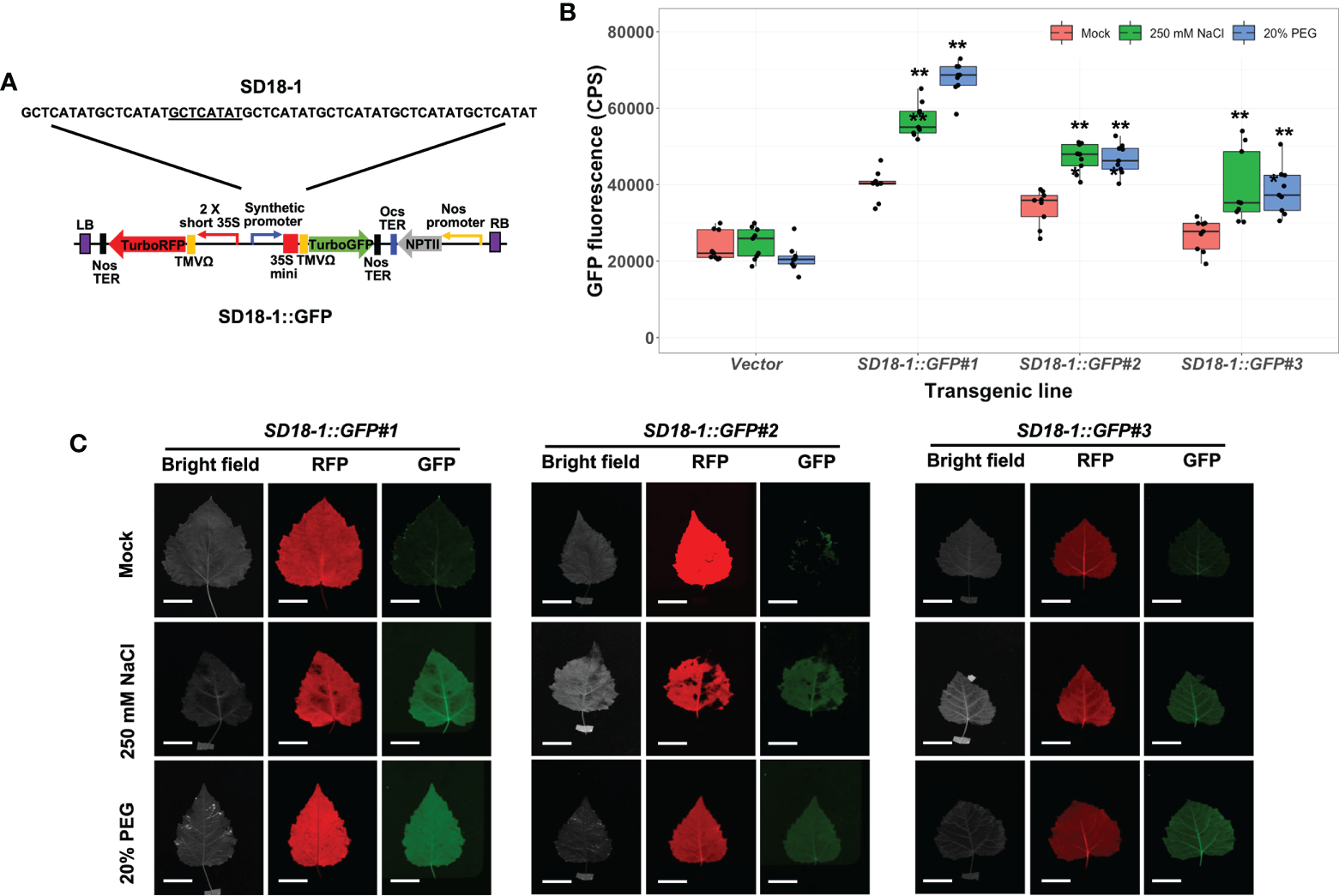 To assess our six synthetic promoters (SD9-1, 9-2, 9-3, 13-1, 18-1, and 18-3) in planta, we first generated stably transformed poplar each carrying one of the six SD promoters. These six short synthetic promoters were produced from poplar A-domain promoter sequences, which activated downstream GFP expression in transient agroinfiltration assays on N. benthamiana leaves under water deficit or high salinity conditions (Yang et al., 2021). Among these synthetic promoters, SD9-2 and SD18-1 reliably induced GFP in transgenic Arabidopsis. However, four other synthetic promoters remained to be tested in planta, as well as testing all six promoters in the poplar system.