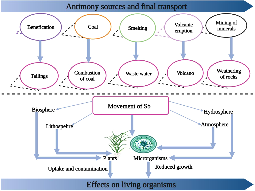 The various sources of Sb entry into environment. Sb enters into environment from burning of coal, smelting, volcanic eruptions and mining of minerals. After entering into environment it cause toxic effects to plants and humans.