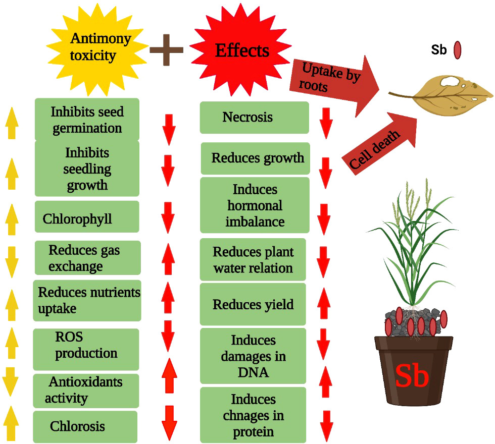 Sb stress reduces the seed germination, seedling growth, chlorophyll contents, nutrient uptake, disturbs hormonal balance, water relations, damage DNA and protein and induce ROS which in turn cause significant reduction in plant growth and development.