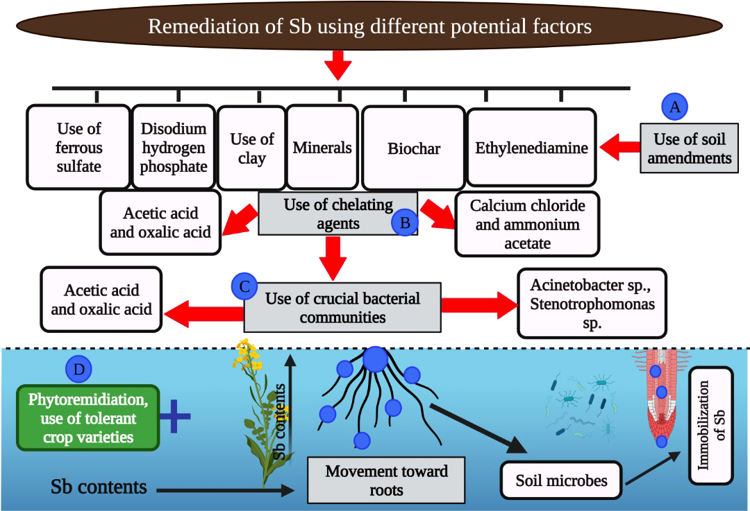 The role of various amendments to mitigate the Sb toxicity in plants. The various carbon based amendments (biochar), chemical treatments (ferrous sulphate, acetic acid, oxalic acid, ammonium acetate, and ethylenediamine) and microbes can cause immobilization of Sb which in turn reduce the toxic effects of Sb on plants.