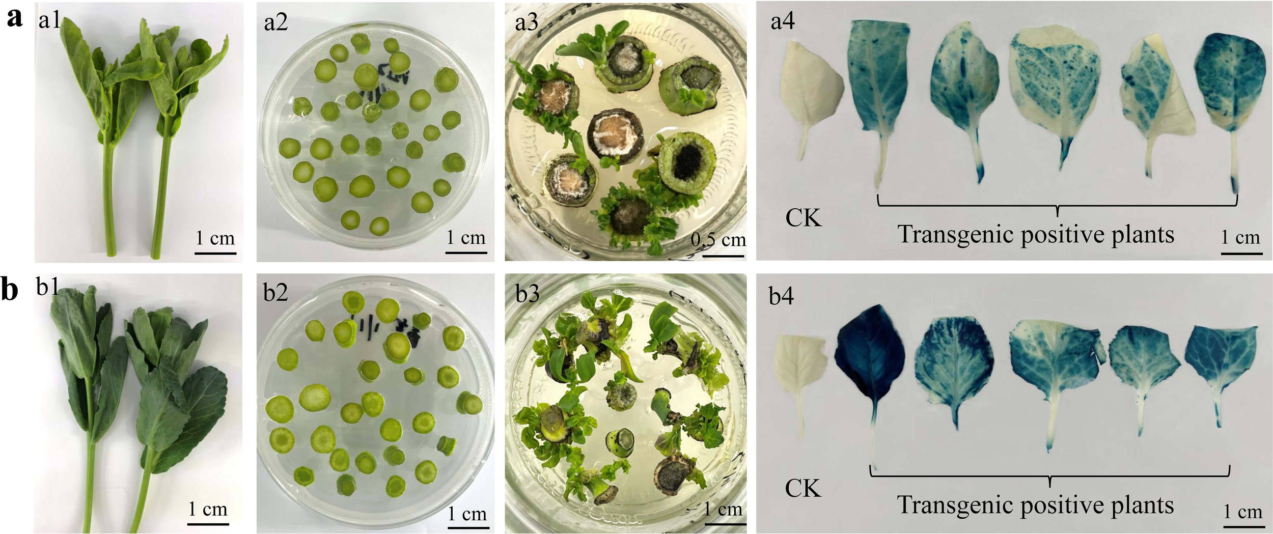 Figure 7 Transgenic plants regenerated from tender stems of lateral branches of Chinese kale (A) and cabbage (B). The tender stems of lateral branches (A1, B1), which were cut into segments with a diameter of 0.3-0.8 cm (A2, B2). Resistant buds were regenerated from the tender stem explants (A3, B3) and the histochemical GUS staining of the leaves from transgenic positive plants (A4, B4).