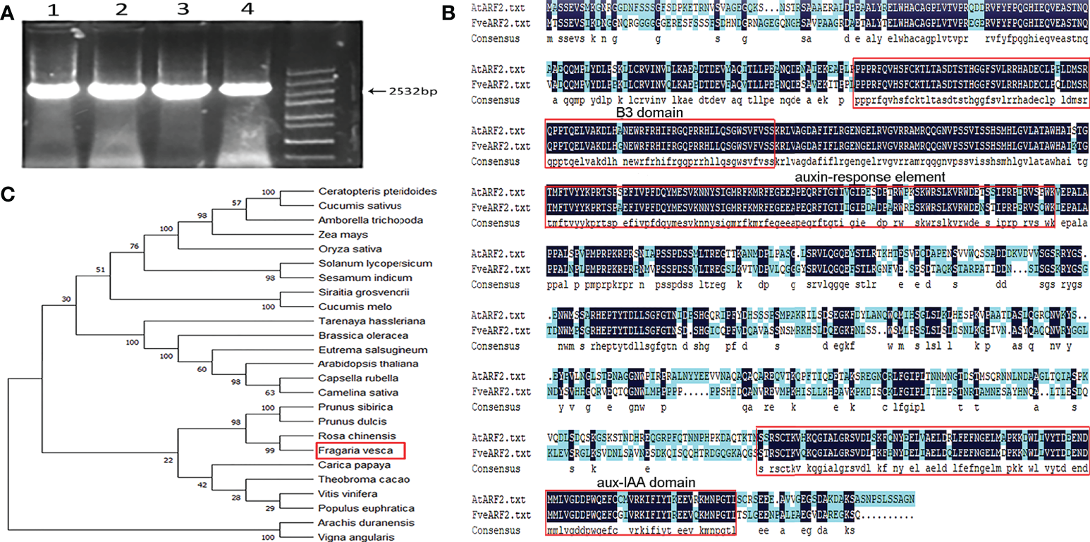 Figure 1 Amplification and structural and phylogenetic analysis of FveARF2. (A) Gene fragment amplification of the FveARF2 CDS. Strips of 1-4 lines represent the FveARF2 CDS region, which is 2532 bp in length. Marker: 5000 bp. (B) Structural and functional alignments of the FveARF2 and AtARF2 amino acid sequences. (C) Phylogenetic tree constructed from amino acid sequence alignments of ARF proteins.