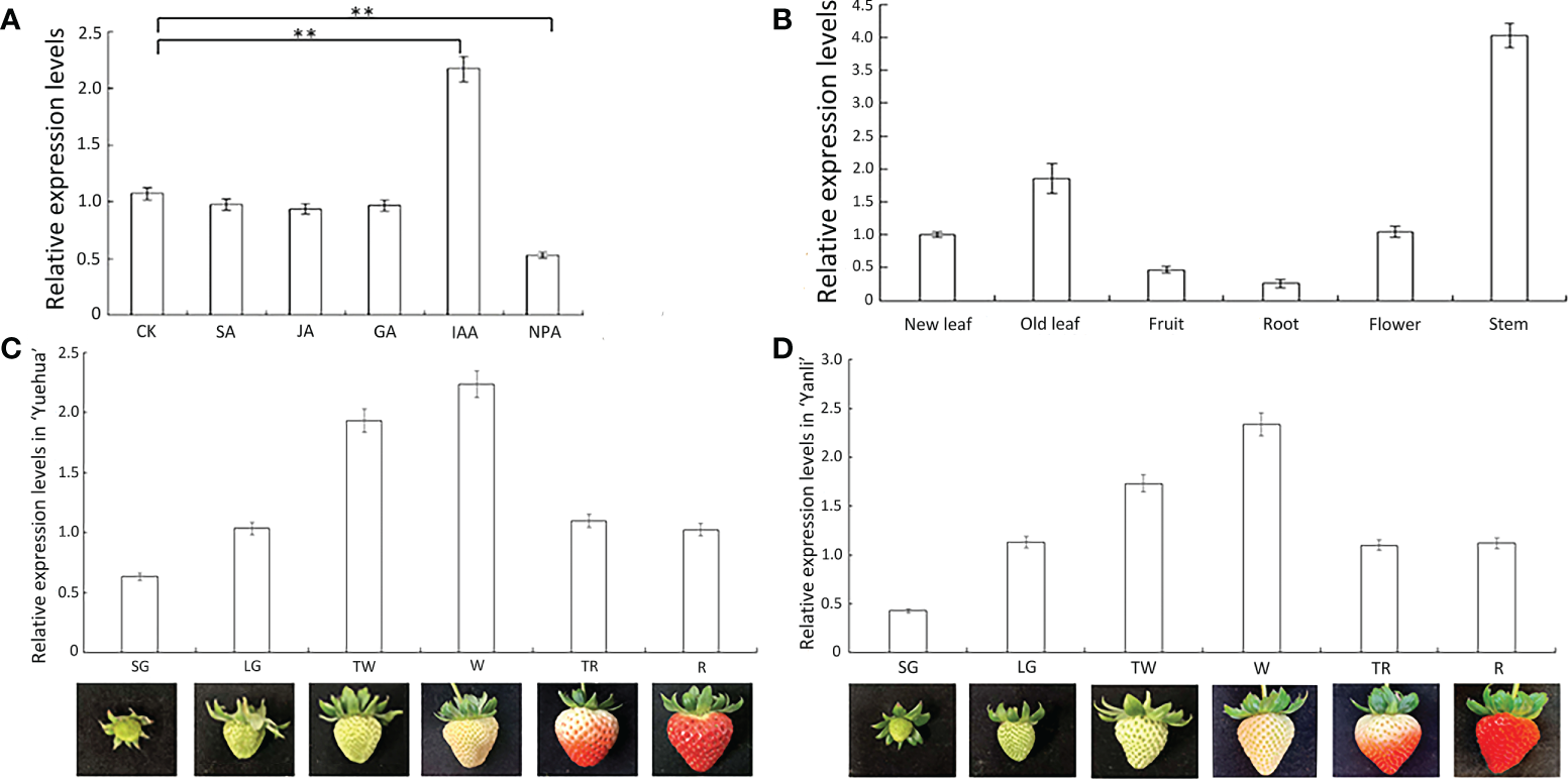 Figure 2 Relative expression characteristics of FveARF2. (A) Expression levels of FveARF2 after different hormone treatments. (B) Expression levels of FveARF2 in different organs of the ‘Ruegen’ cultivar. (C, D) Expression levels of FveARF2 at different developmental stages of strawberry cultivars ‘Yuehua’ and ‘Yanli’ fruit. Values are the mean ± SD from three independent experiments with three biological replicates. ‘**’ Indicates very significantly different (P < 0.01, Duncan’s multiple range test).