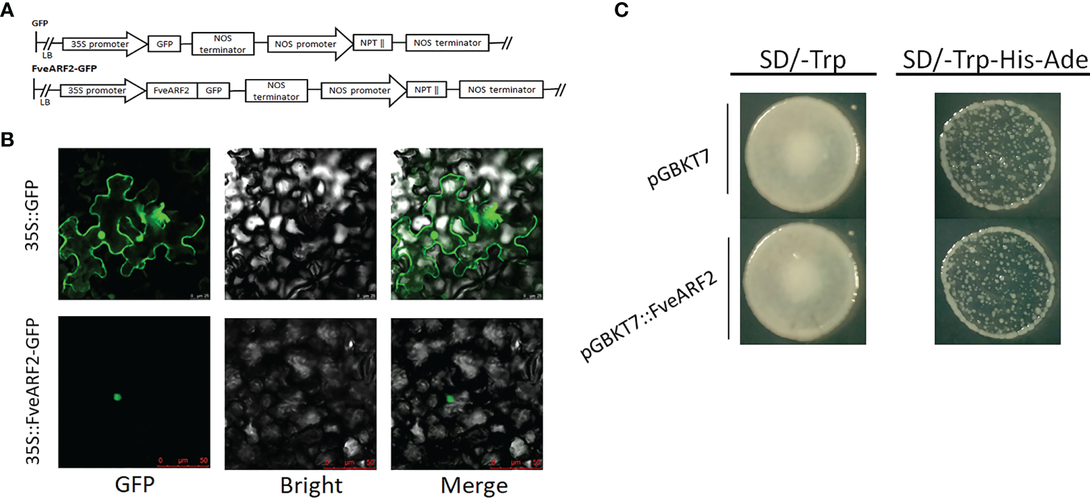 Figure 3 Subcellular localization and transcriptional activity of FveARF2. (A) Structural diagram of the 35S::GFP vector and the 35S::FveARF2-GFP construct. (B) Subcellular localization of the FveARF2 protein in Nicotiana benthamiana leaves. 35S::GFP (top) 35S::FveARF2-GFP were expressed in tobacco leaves (bottom), and visualized in the nucleus. Bar = 30 μm. (C) Yeast Y1H Gold cells transformed with pGBKT7::FveARF2 and analysis of these cells on SD/-Trp and SD/-Trp-His-Ade plates to evaluate whether FveARF2 has transcriptional activation activity.