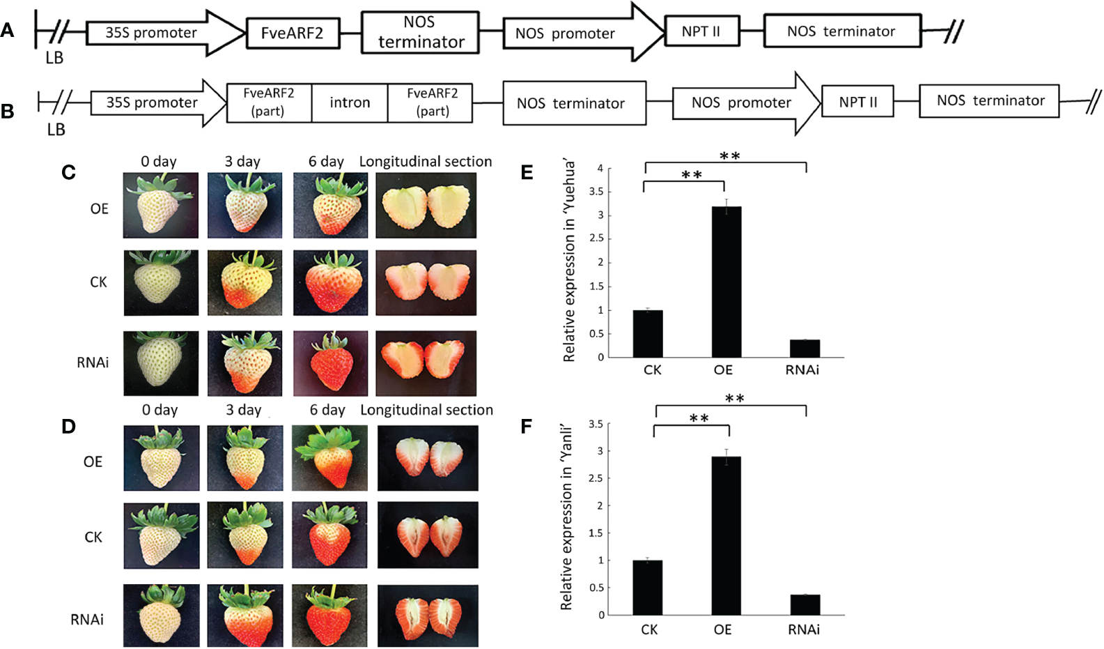Figure 4 Phenotypic investigation of transgenic strawberry fruit. (A) Structural diagram of the vector used to overexpress FveARF2 using the CaMV 35S promoter. (B) Structural diagram of the FveARF2-RNAi vector driven by the CaMV 35S promoter. (C) ‘Yuehua’ and (D) ‘Yanli’ fruit overexpressing FveARF2 matured later, while silencing FveARF2 induced fruit maturation in both cultivars when compared with the control. The relative expression of FveARF2 in transgenic (E) ‘Yuehua’ and (F) ‘Yanli’ fruit, respectively. Values are the mean ± SD from three independent experiments with three biological replicates. ‘**’ Indicates very significant differences (P < 0.01, Duncan’s multiple range test).
