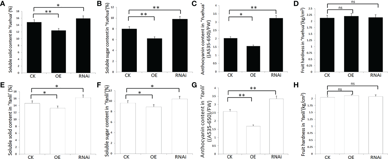 Figure 5 Physiological indexes of transgenic strawberry fruit in ‘Yuehua’ and ‘Yanli’. Soluble solid, soluble sugar, and anthocyanin content and fruit hardness in transgenic (A-D) ‘Yuehua’ and (E-H) ‘Yanli’ fruit, respectively. Values are the mean ± SD from three independent experiments with three biological replicates. ‘*’ Indicates significant difference (P < 0.05, Duncan’s multiple range test); ‘**’ indicates very significant differences (P < 0.01, Duncan’s multiple range test); ns indicates no significant difference.