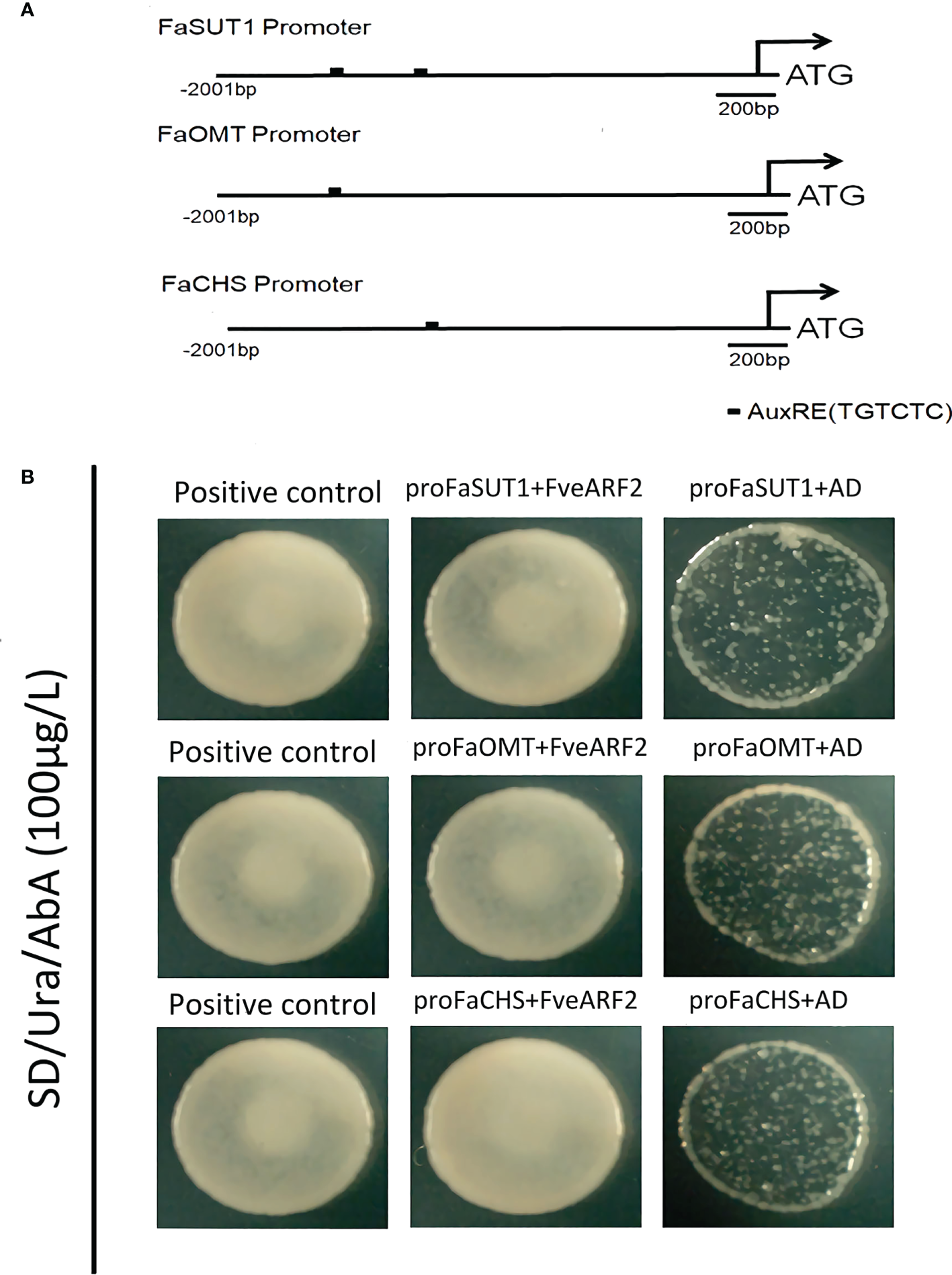 Figure 7 Y1H hybrid between FveARF2 and FaSUT1, FaOMT, and FaCHS promoters. (A) Structural diagram of FaSUT1, FaOMT, and FaCHS promoters. The block represents the AuxRE element (TGTCTC). (B) FveARF2 can bind to FaSUT1, FaOMT1, and FaCHS promoter in vitro. Positive control: p53::AbAi+p53::pGADT7.