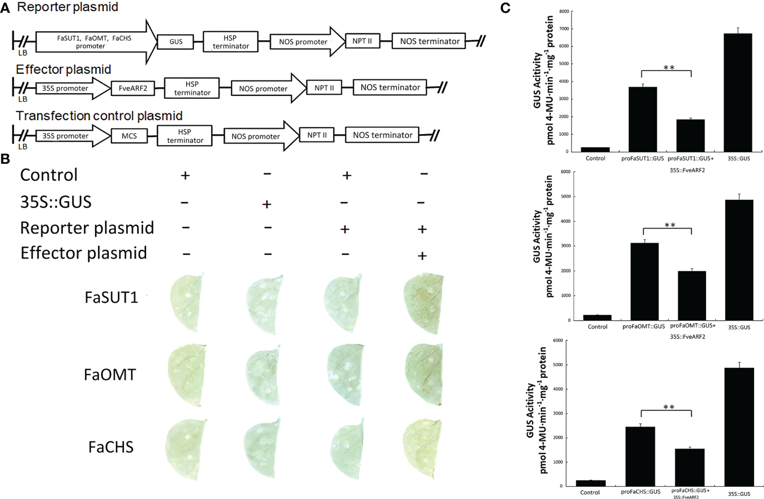 GUS staining and activity assays were performed as described by Jefferson et al. (1987). The FveARF2 sequence was ligated into the pRI101-AN vector, while the FveKT12, FaOMT, FaSUT1, and FaCHS promoter fragments were amplified and individually inserted into the pRI201-GUS vector using the primer pairs pFveKT12-F/R, pFaOMT-F/R, pFaSUT1-F/R, and pFaCHS-F/R (Table S1), respectively. Using pRI201-GUS containing 35S::GUS as a control, the vectors were infiltrated into N. benthamiana leaves. After three days, leaves were treated with GUS staining solution (100 mM sodium phosphate buffer, 0.1% Triton X-100, 0.1% N-laurylsarcosine, 10 mM Na2EDTA, 1 mM K3Fe(CN)6, 1 mM K4Fe(CN)6, 0.5 mg·mL-1 X-Gluc) for 24 h in the dark. Leaves were decolorized with 70% alcohol until the control sample was transparent. Total protein was extracted from the leaves, and GUS protein content was determined as described by Bradford (1976). Protein concentration and enzyme activity were measured using a Cary Eclipse fluorescence spectrophotometer.