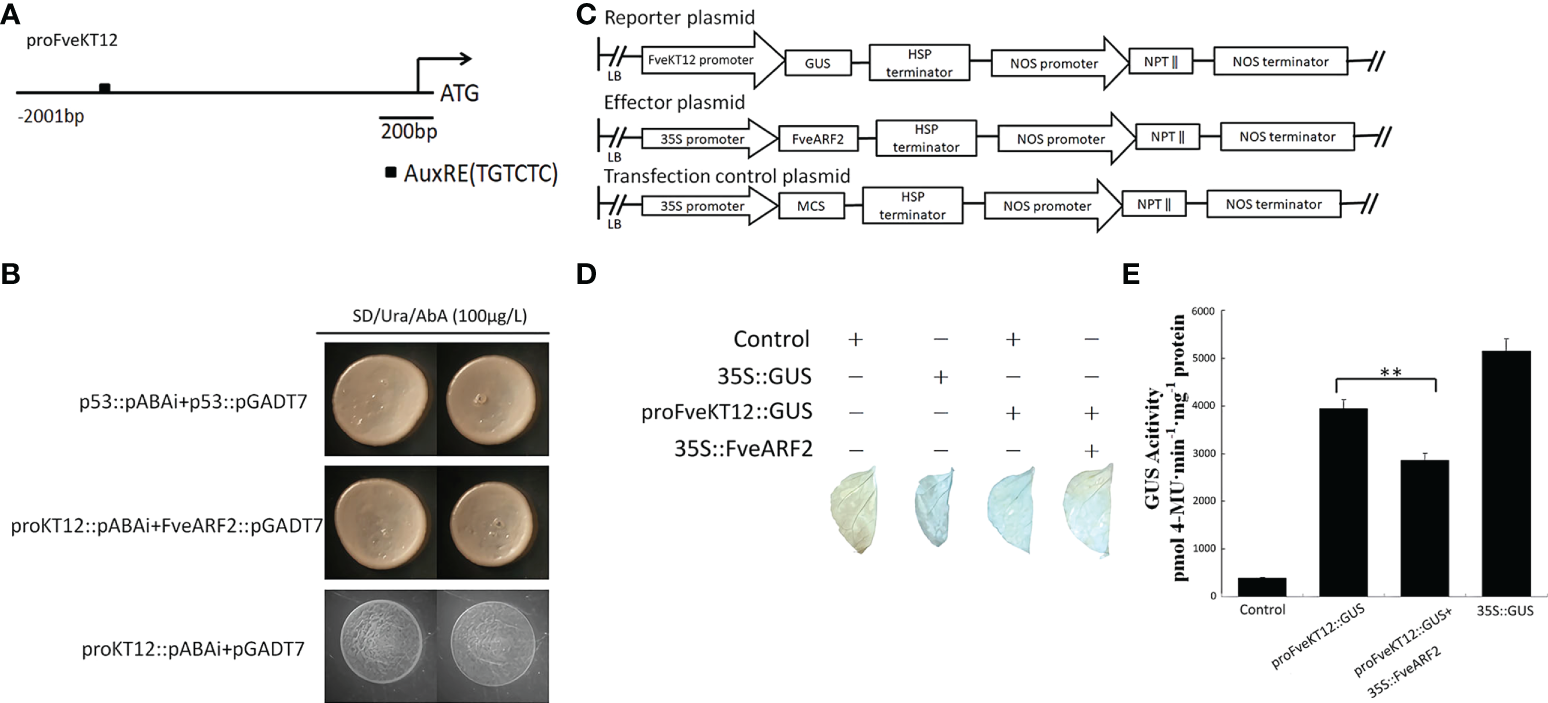 To verify whether FveARF2 can negatively regulate the expression of FveKT12, we downloaded and cloned the promoter of FveKT12 from GDR (https://www.rosaceae.org/). Sequence analysis revealed that the FveKT12 promoter contained an AuxRE element (Figure 10A), suggesting that FveARF2 could bind to the FveKT12 promoter. To verify this hypothesis, yeast one-hybrid (Y1H) analysis and GUS activity analysis were performed. The Y1H assay indicated that FveARF2 could bind to the AuxRE element of the FveKT12 promoter in yeast (Figure 10B). The FveKT12 promoter was then individually inserted into the pRI201-GUS vector as a reporter, and FveARF2 driven by the 35S promoter was used as the effector in a transient tobacco leaf expression assay. We observed that FveARF2 could also repress the transcription of FveKT12 in vivo (Figures 10C-E). The Y1H hybrid and GUS activity assays suggested that FveARF2 directly binds to the FveKT12 promoter and inhibits its transcription.