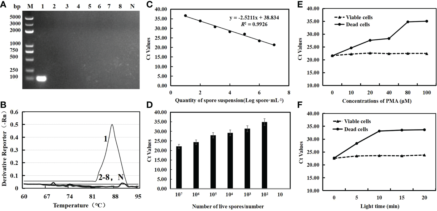 Specific detection for primer CC-F3/CC-R3 where M is a ladder (100 bp) DNA ladder (A) and the melting curve of qPCR for gradient dilution genome DNA of C. cassiicola(B); lane 1 is C. cassiicola samples, lane 2 is Pseudoperonospora cubensis samples, lane 3 is Sphaerotheca cucurbitae samples, lane 4 is Pseudomonas syringae samples, lane 5 is Fusarium oxysporum samples, lane 6 is Alternaria cucumerina samples, lane 7 is Cladosporium cucumerinum samples, lane 8 is Colletotrichum orbiculare samples, and lane N is ddH2O. PMA-qPCR standard curve (C) and sensitivity analysis (D); Effects of PMA concentrations (E) and light time (F) on the amplification of DNA from viable and dead C. cassiicola spores at 107 spore·mL−1. Ct, cycle threshold.