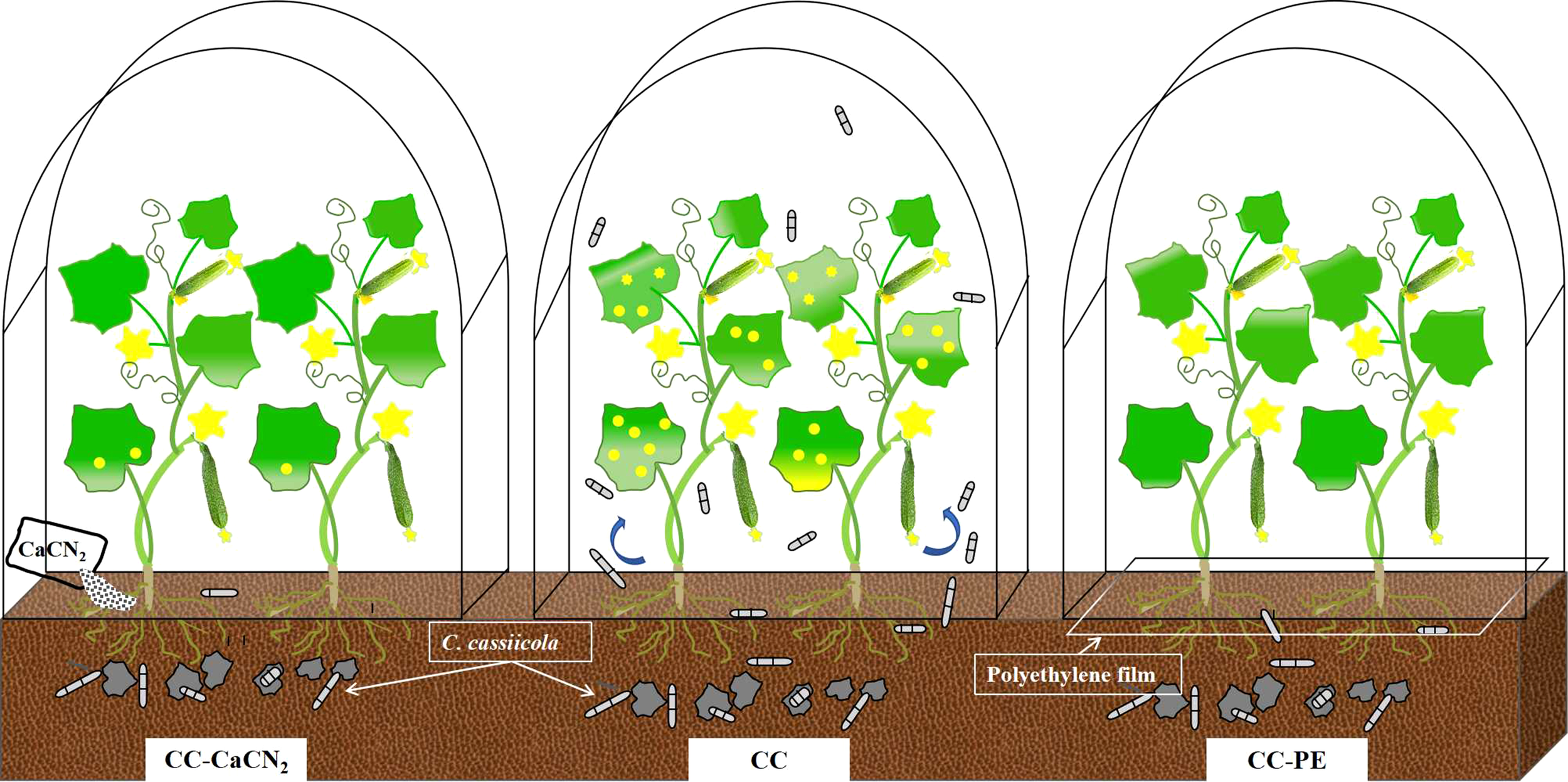 Calcium cyanamide (CaCN2) is not only a good fertilizer but also a good suppressor of soil-borne pathogens (Shi et al., 2009). CaCN2 breaks down into hydrogen cyanamide in the soil, which is highly toxic to soil microbes (Shi et al., 2009). Application of CaCN2 effectively suppresses clubroot disease in cabbage, fusarium wilt in cucumber and melon, etc. (Shi et al., 2009). Covering plants with polyethylene film is common in agricultural production; while this action can prevent the transmission of disease residues in the soil by air, it can also cause plant diseases and play a role in isolation (Yoshiaki, 1994). Whether the above two soil treatments have a good control effect on soil residues remains worth studying.