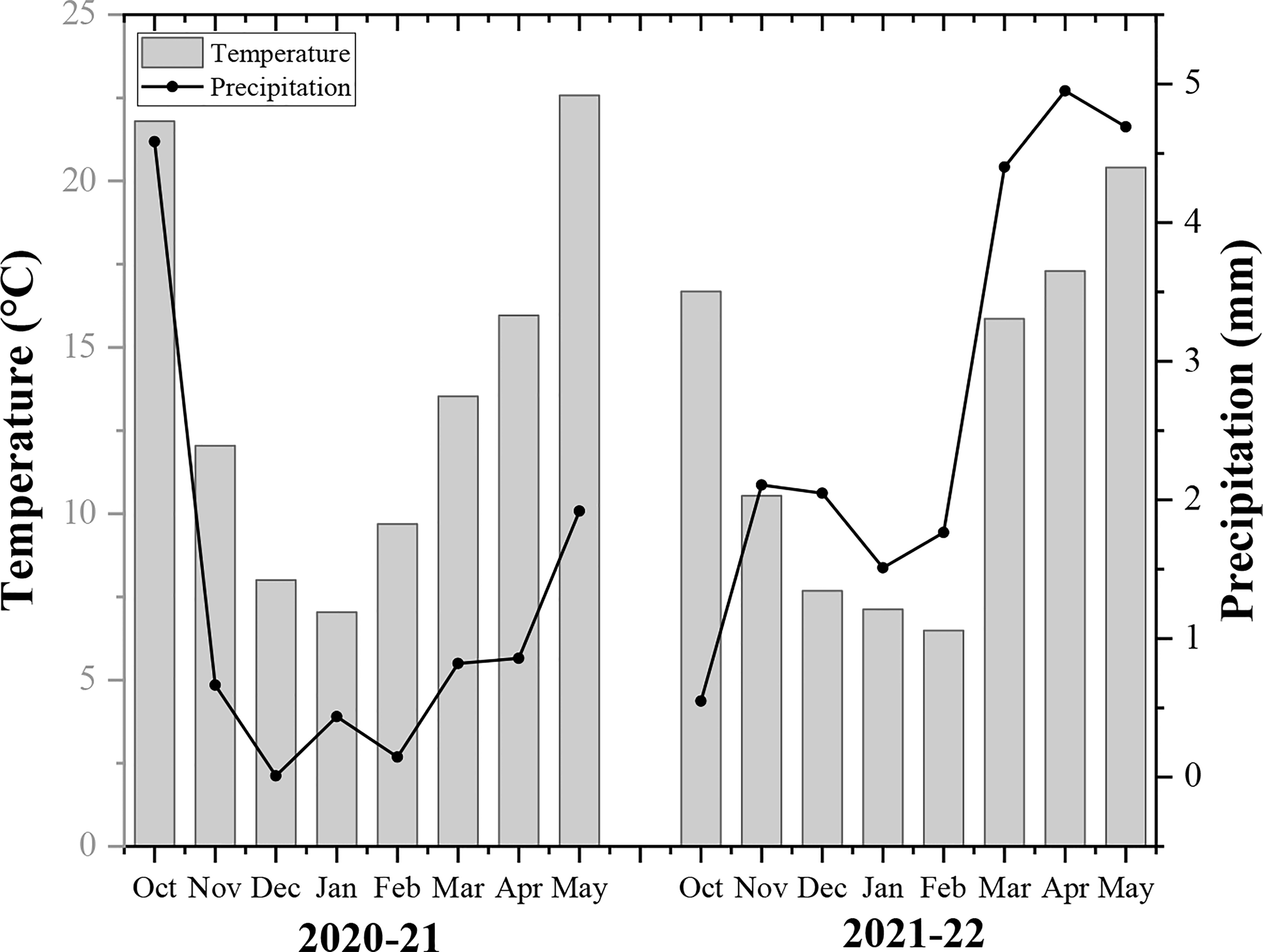 The monthly average temperature and precipitation of rapeseed growing seasons (2020-22).