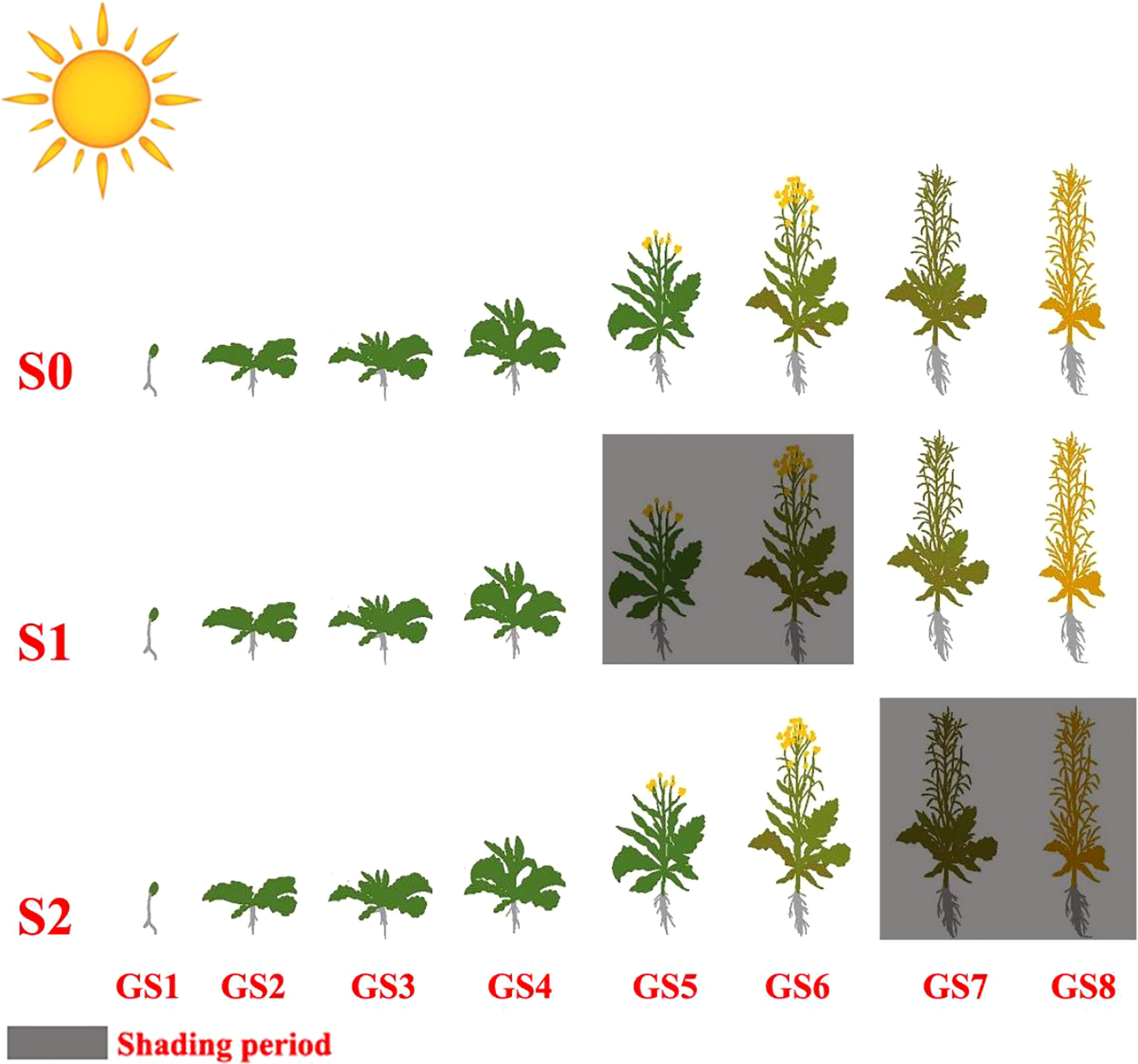 Diagrammatic representation of shading treatment at different growth stages of rapeseed. Control (ambient light) (S0); shade from GS5 to GS6 (S1); shade from GS7 to GS8 (S2); germination and emergence stage (GS1); leaf development stage (GS2); side-shoot development stage (GS3); stem prolongation stage (GS4); inflorescence emergence (GS5); flowering stage (GS6); pod development (GS7); harvesting stage (GS8).