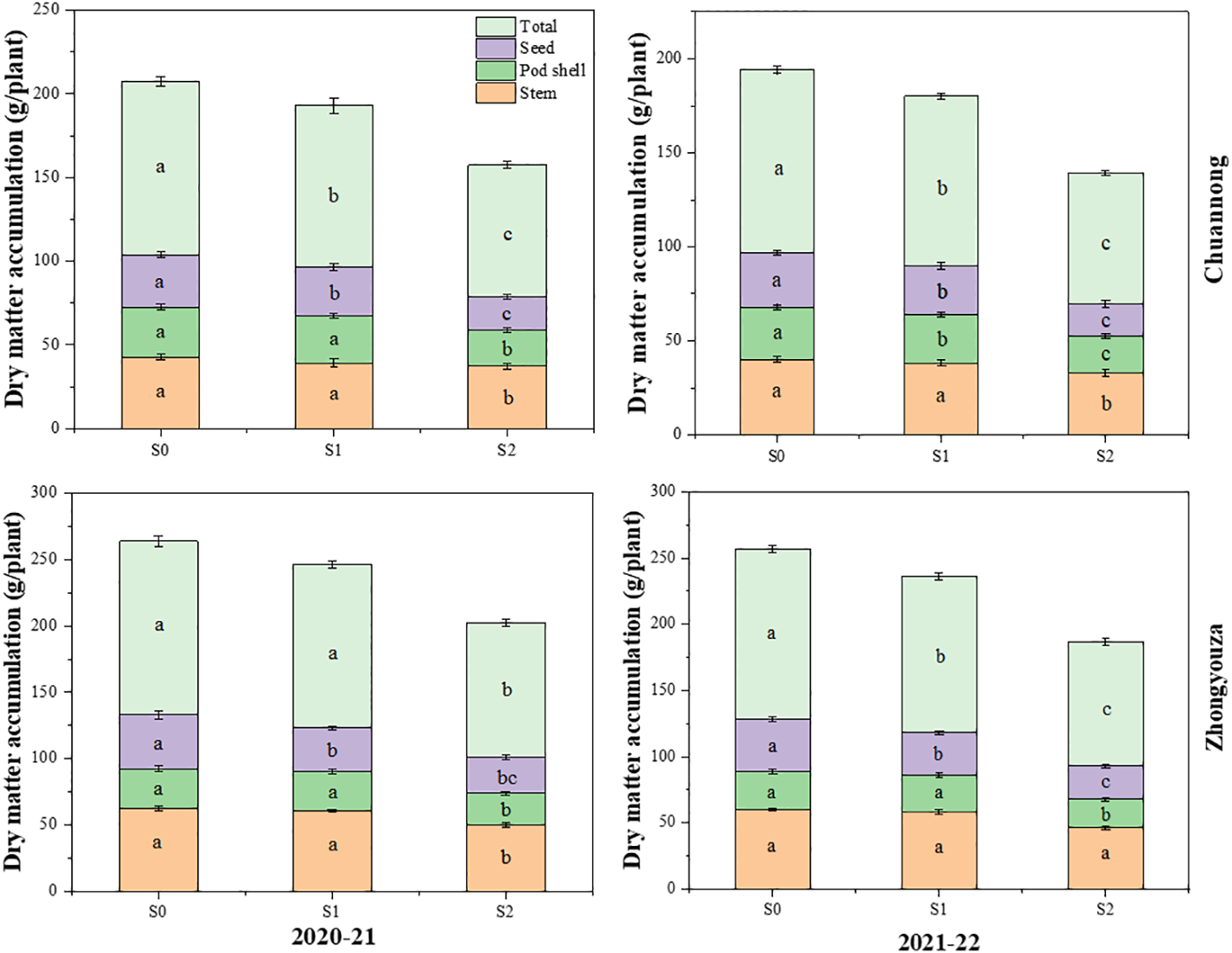 Effect of shading on dry matter accumulation in rapeseed. S0= control (ambient light); S1= shade at the whole flowering stage and S2= shade at the start of pod development to pod maturity. Values were determined using the (n=10) LSD test, and various small letters denote the significance level of treatments at the 0.05 probability level (Duncan test).
