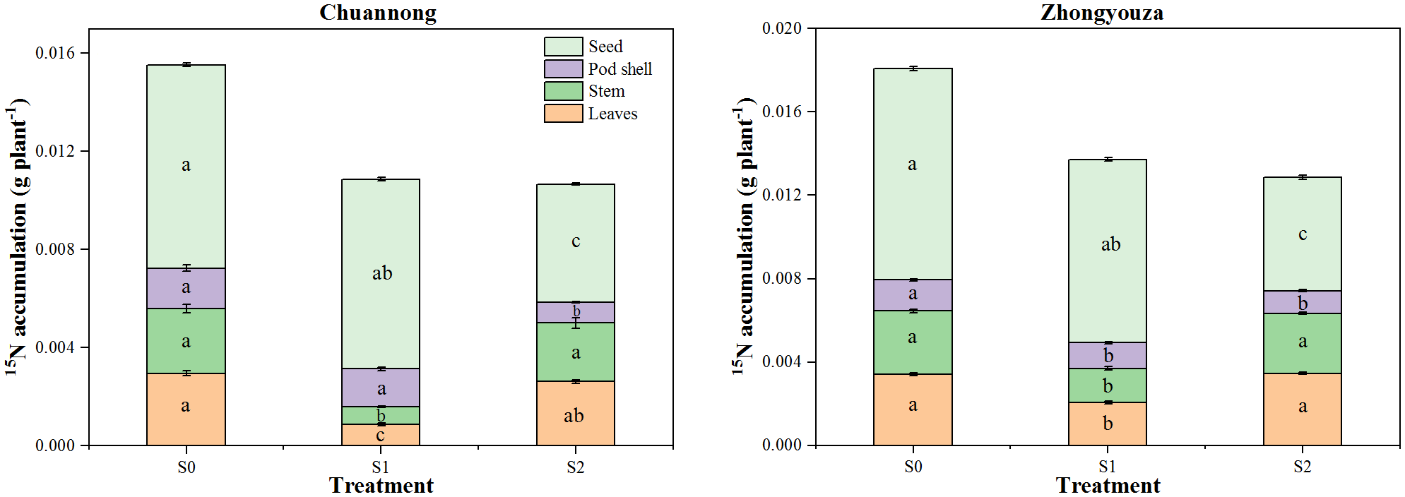 Distribution of 15N to different plant organs of rapeseed at maturity under different shade conditions. S0= control (ambient light); S1= shade at the whole flowering stage and S2= shade at the start of pod development to pod maturity. Values were determined using the (n=3) LSD test, and various small letters denote the significance level of treatments at the 0.05 probability level (Duncan test).