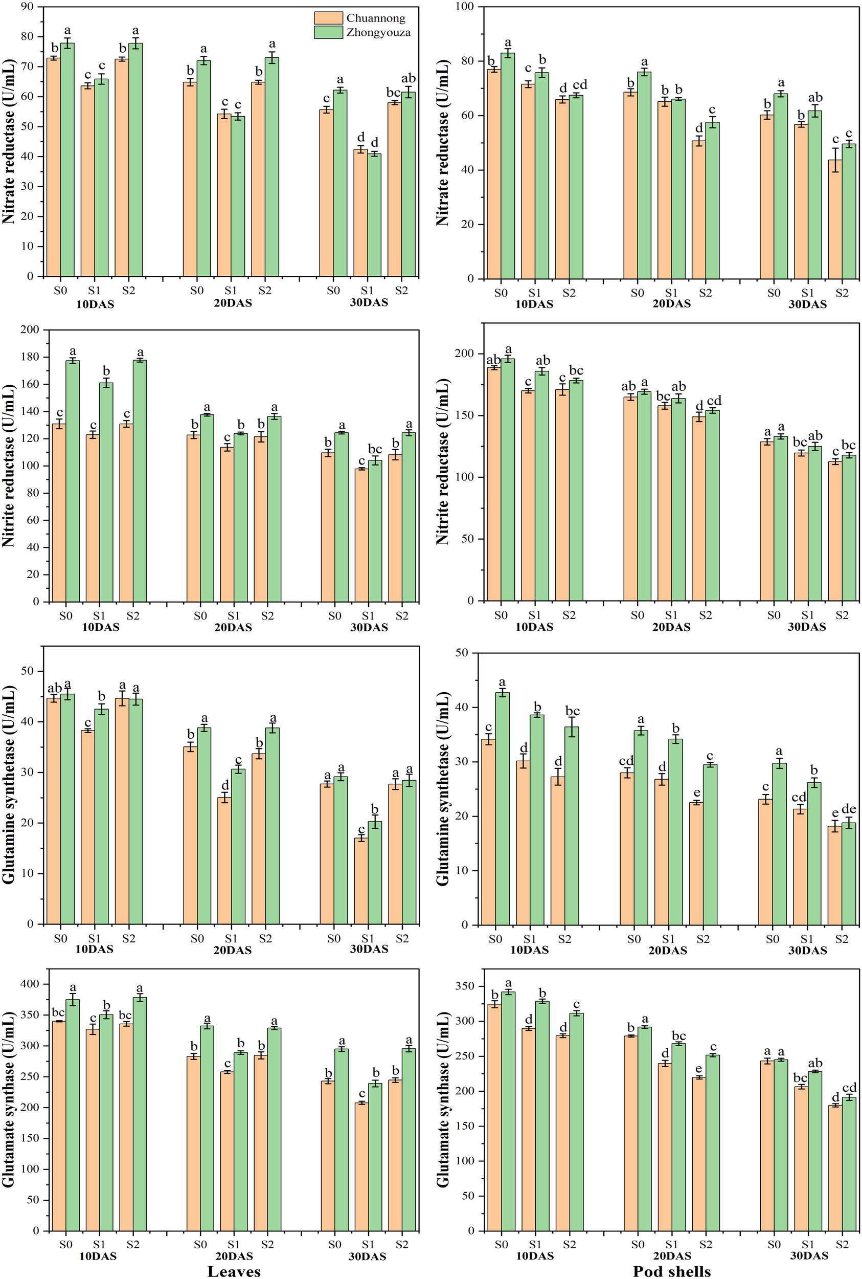 The shading stress at both growth stages considerably influenced the enzymatic activities in the leaves and pod shells of both the studied genotypes. Relative to S0, the S1 reduced the NR, NiR, GS and GOGAT activities by 20.65, 8.60, 33.74 and 9.24% in leaves of Chuannong, respectively. Whereas the Zhongyouza experienced a 28.31, 12.96, 21.47 and 14.05% reduction following S1 as compared to S0, respectively (Figure 6).