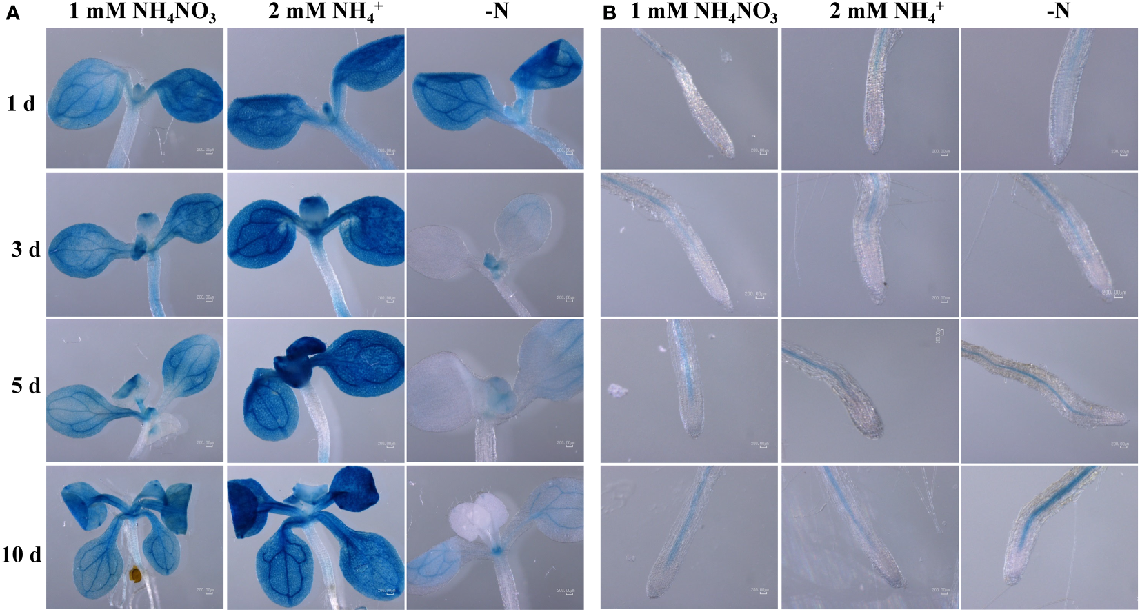 Seedlings of Arabidopsis transgenic lines containing the GUS reporter gene (uidA, pMDC164) driven by ScAMT2;1 endogenous promoter were cultivated on half-strength MS media without N (-N) or supplied with 2 mM NH4Cl or 1 mM NH4NO3 as the sole N source for up to 10 d. For GUS staining, plants were transferred to buffer containing 5‐bromo‐4‐chloro‐3‐indolyl glucuronide (X-Gluc; Jersey Lab and Glove Supply, Livingston, NJ, USA) at 37°C for 4 h 30 min and then washed in 70% ethanol (Jefferson et al., 1987). Plant tissues were analyzed and photographed under a Nikon SMZ18 stereo microscope.