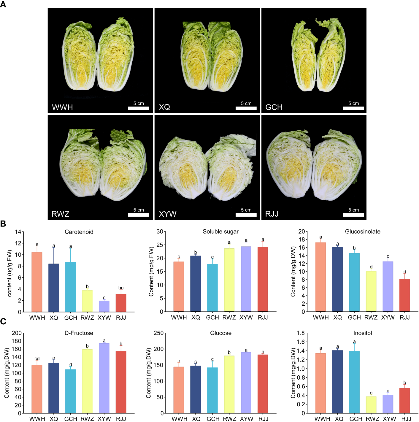 Figure 1 The contents of carotenoid, soluble sugar and glucosinolate in yellow and white inner-leaf Chinese cabbage. (A) the phenotype of yellow (WWH, XQ, GCH) and white (RWZ, XYW, RJJ) inner-leaf Chinese cabbage. Scale bars are 5 cm. (B) Carotenoid, Soluble sugar and Glucosinolate content. (C) D-Fructose, Glucose and Inositol content. Data are means ± SD, N = 3. Different letters indicate significant differences among six Chinese cabbage by t-tests (p ≤ 0.05).