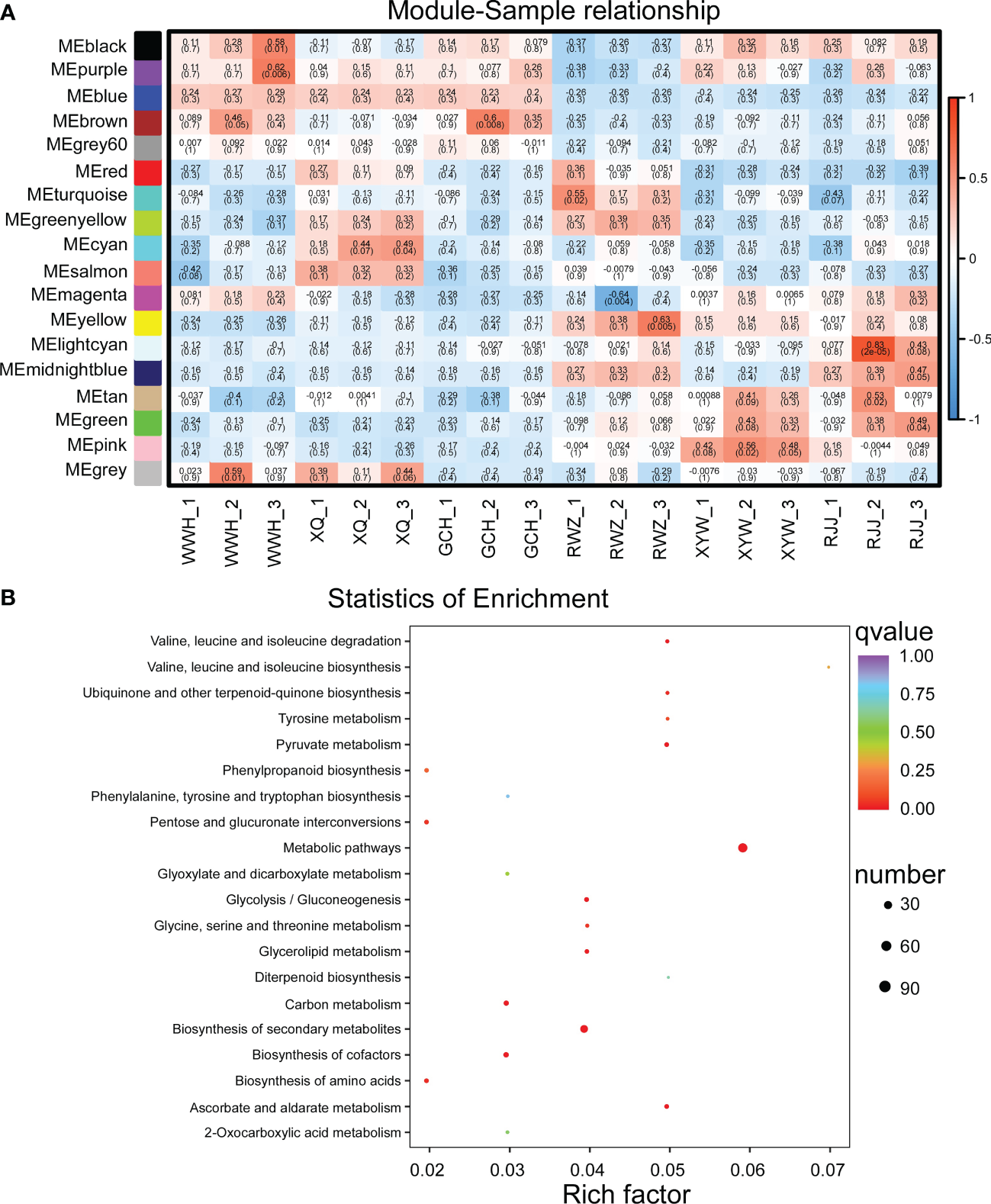 Figure 3 WGCNA of RNA-Seq data. (A) Eigen gene adjacency heatmap. (B) KEGG enrichment of DEGs in the blue module. Each bubble represents a metabolic pathway. A larger bubble size indicates a more considerable impact factor. The bubble colors represent the p-values of the enrichment analysis.