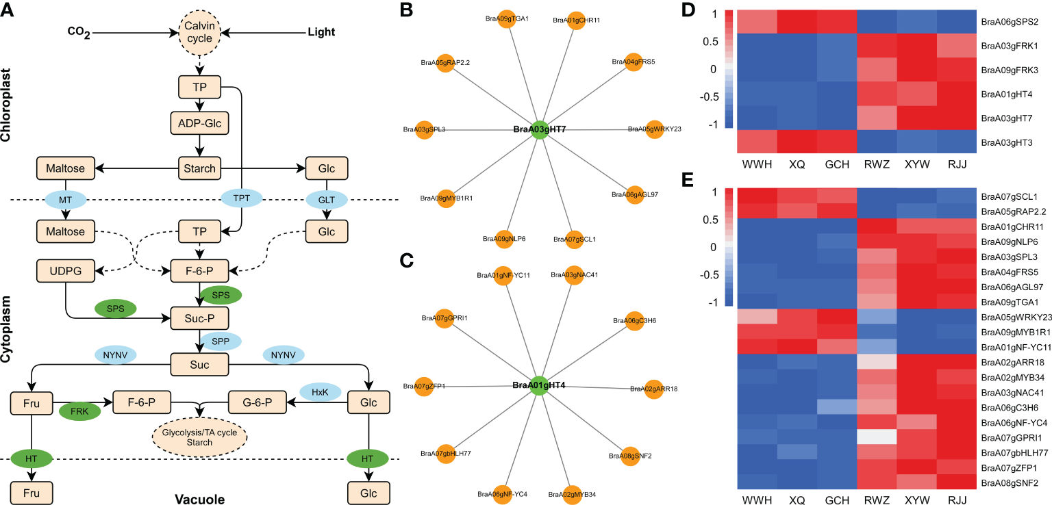 Figure 4 Pathway related to soluble sugar biosynthesis in Chinese cabbage. (A) Reconstruction of the soluble sugar biosynthetic pathway with the differentially expressed structural genes. Green ellipses represent essential genes we identified by RNA-Seq, and blue ellipses represent the genes involved in the glucosinolate biosynthesis. (B) Heatmap of the DEGs involved in soluble sugar biosynthetic pathway. (C) Correlation network of essential gene and transcription factors in the blue module. (D) Correlation network of structural genes and transcription factors in the green module. Green circles represent structural genes, and orange circles represent TFs. (E) The expression of transcription factors involved in soluble sugar biosynthesis in RNA-Seq result.
