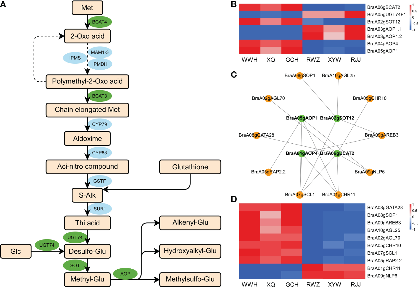 Figure 5 Aliphatic glucosinolate biosynthesis in Chinese cabbage. (A) Reconstruction of the aliphatic glucosinolate biosynthetic pathway with the differentially expressed structural genes. Green ellipses represent essential genes we identified by RNA-Seq; blue ellipses represent the genes involved in the glucosinolate biosynthesis. (B) Heatmap of the DEGs involved in aliphatic glucosinolate biosynthesis. (C) Correlation network of crucial genes involved in aliphatic glucosinolate biosynthesis in yellow and white inner-leaf Chinese cabbage. Green circles represent structural genes; orange circles represent TFs. (D) The expression of transcription factors involved in glucosinolate biosynthesis in RNA-Seq result.