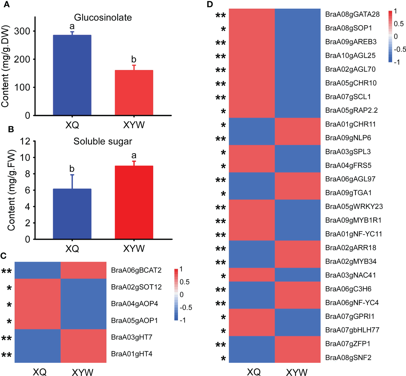 Figure 7 Expression analysis of key genes related to soluble sugar and glucosinolate biosynthesis in yellow and white inner-leaf Chinese cabbage. (A) Glucosinolate content at the seedling stage. (B) Soluble sugar content at the seedling stage. Data are means ± SD, N = 3. Lowercase letters indicate that there are significant differences between ‘XQ’ and ‘XYW’ (P ≤ 0.05). (C) Relative expression of structural genes involved in glucosinolate and soluble sugar biosynthesis at the seedling stage. (D) The expression of transcription factors involved in glucosinolate and soluble sugar biosynthesis at the seedling stage. Asterisks indicate statistical significance using Student’s t-test: *,P ≤ 0.05, **,P ≤ 0.01.