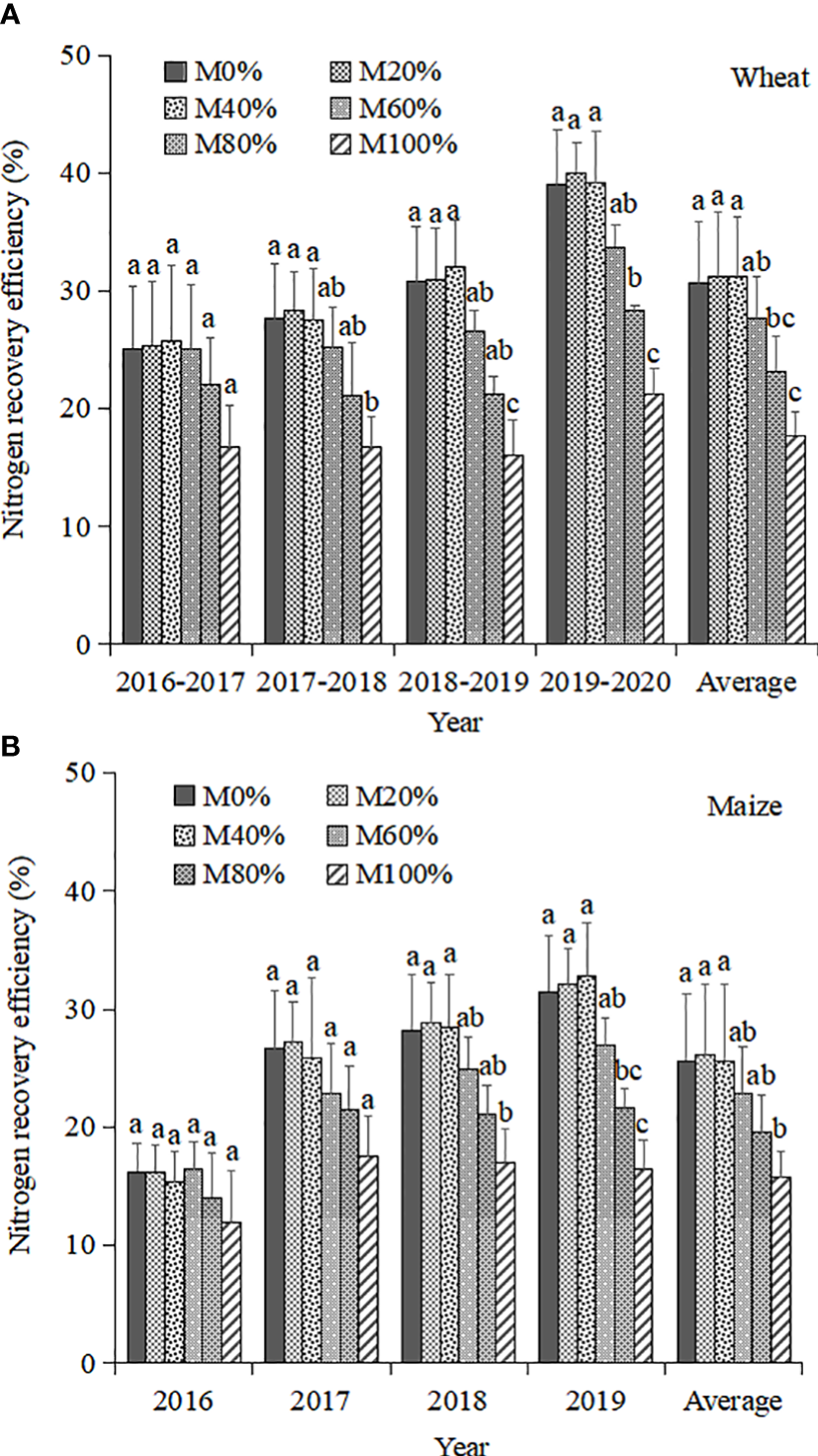 Nitrogen recovery efficiency of wheat (A) and maize (B) under treatments with different ratios of chicken manure substitution for mineral nitrogen fertilizer.