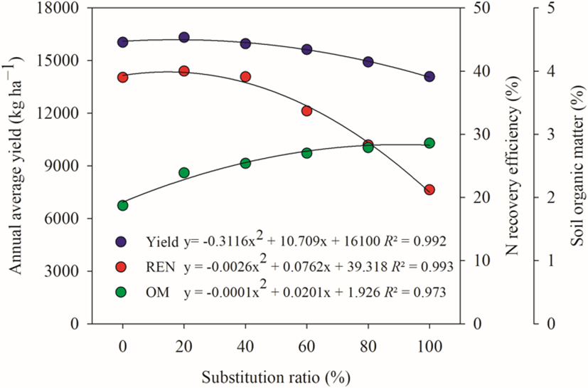 Relationship between different N fertilizer substitution ratios and average annual yield, N recovery efficiency (REN) and soil organic matter (OM) content in the wheat-maize rotation system.