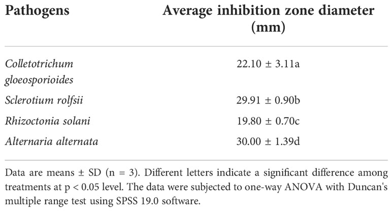 Strain XY-1 was tested for antagonism against several common crops and fruit tree pathogens by using dual culturing assays. The results showed that XY-1 displayed an inhibitory effect on the growth of four tested pathogens, namely Colletotrichum gloeosporioides, Rhizoctonia solani, Sclerotium rolfsii, and Alternaria alternate. The zone of inhibition ranged from 17.7 to 32 mm. In addition, XY-1 exhibited the best inhibitory effect on Alternaria alternata, followed by Sclerotium rolfsii (Table 1).