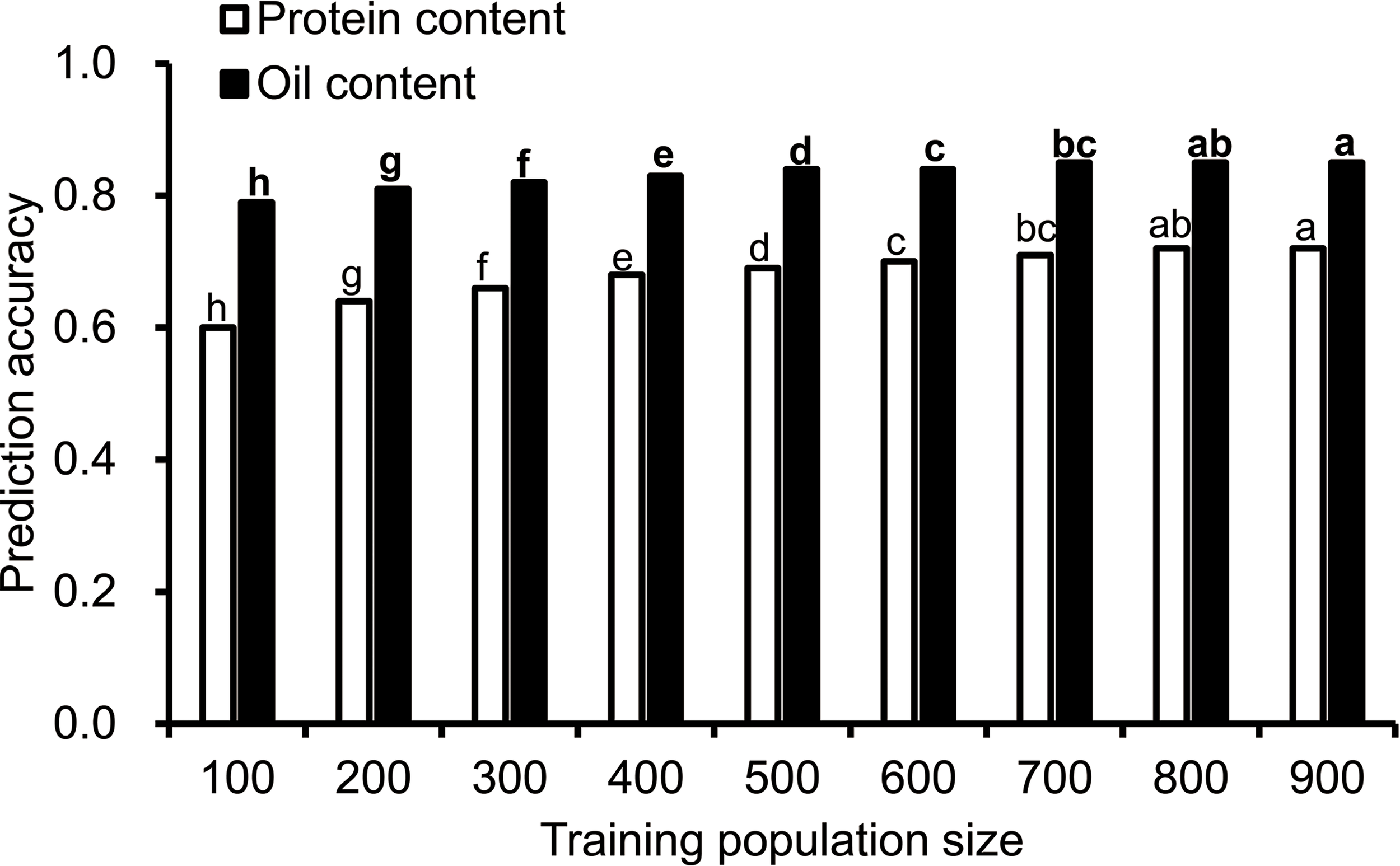 Figure 1 The influence of training population size on prediction accuracy. Cross-validated prediction accuracies of ridge regression best linear unbiased prediction (RR-BLUP) for protein and oil content among 1,007 soybean germplasms grown at Urbana, IL in 2001 and 2002. "a–h" indicates the difference between different columns. The difference between columns marked with different letters was significant (P<0.05), and there was no significant difference between columns marked with the same letter.