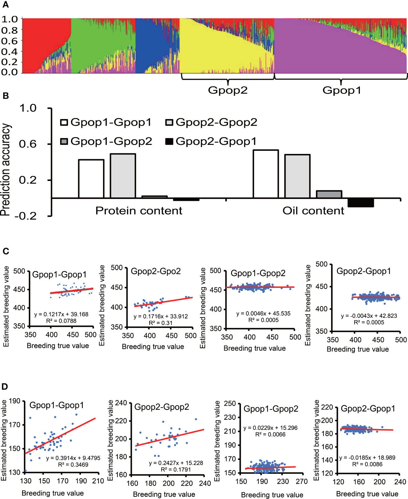 Figure 3 The effect of genetic similarity between the training population and prediction population. The prediction accuracies of RR-BLUP for protein and oil content among soybean germplasms grown at Urbana, IL in 2001 and 2002 (B), when the training population and prediction population were selected according to genetic structure (A). (C) Scatter plot of protein content, abscissa for breeding true value, ordinate for estimated breeding value, the red line is the trend line. (D) Scatter plot of oil content.