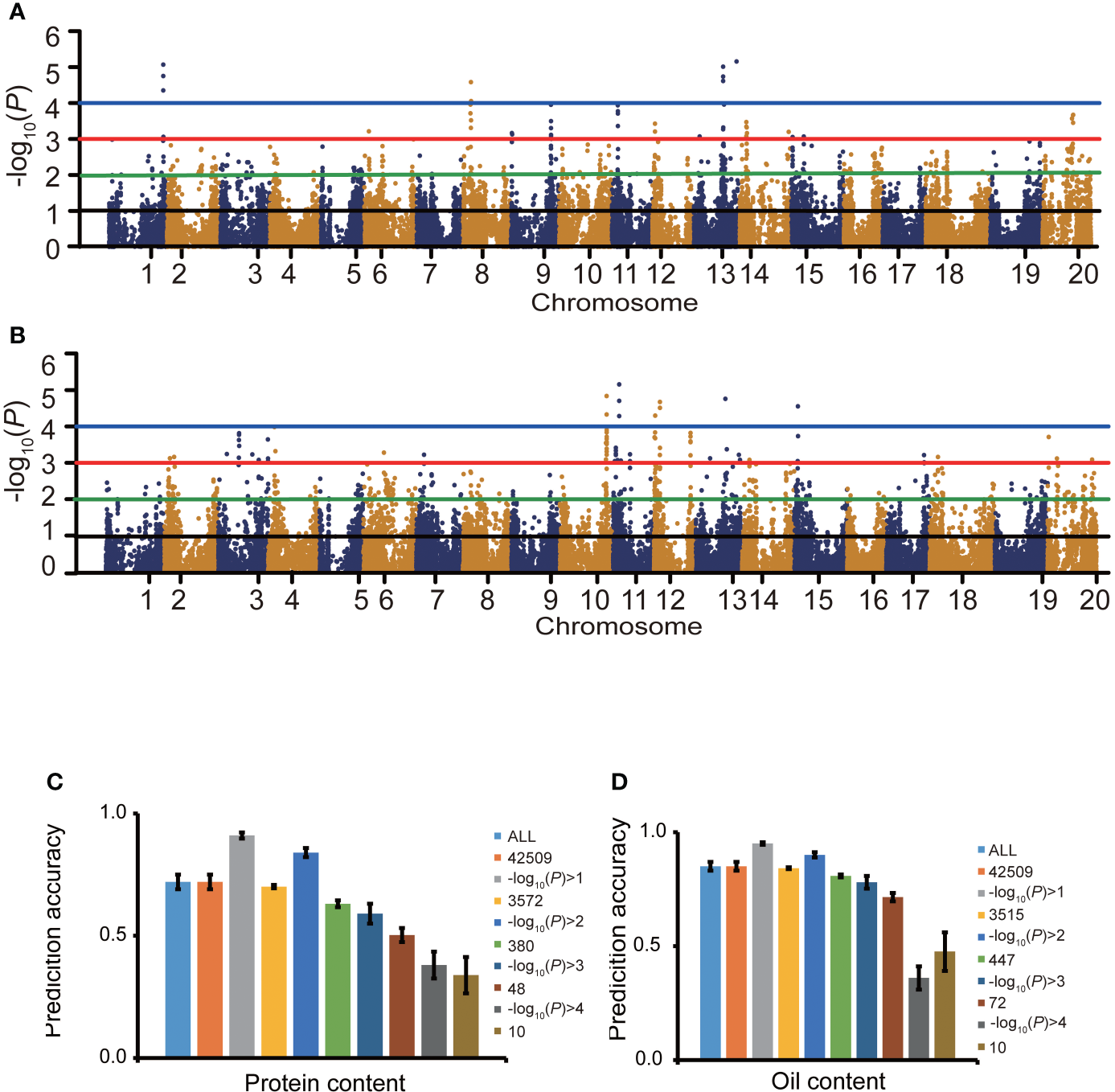 Figure 4 The effect of marker association with the trait on prediction accuracy. Manhattan plots for protein content (A) and oil content (B). Effects of marker sampling strategies on cross-validated prediction accuracies of RRBLUP for protein content (C) and oil content (D) among 1,007 soybean germplasms grown at Urbana, IL in 2001 and 2002. Marker subsets were selected using random sampling (C, D) and an -log10(P) value-based sampling strategy (A, B). The number of markers for random selection was the same as the number of markers selected based on the -log10(P) value.