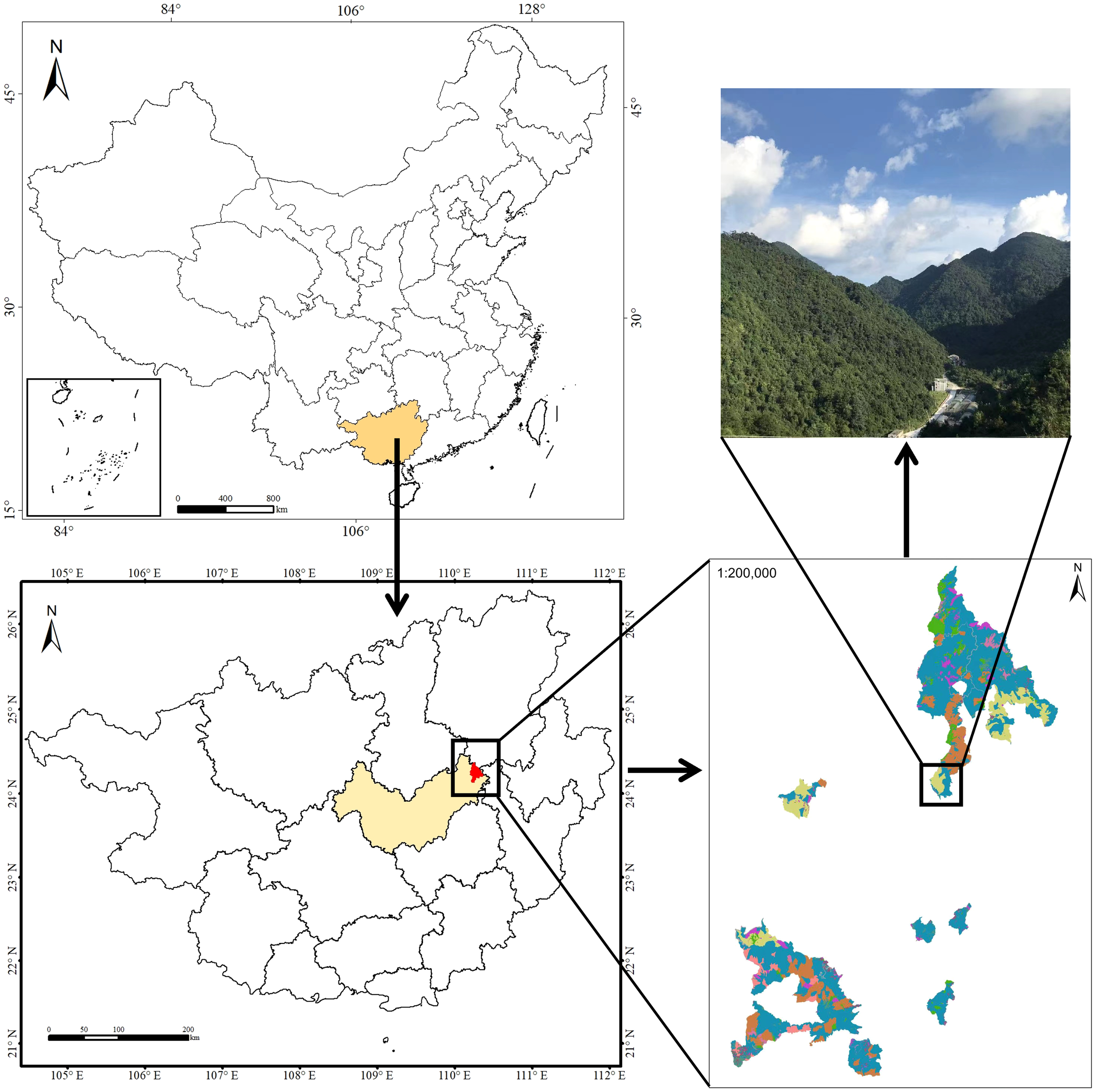 The study area was located in an evergreen broadleaf karst forest at the Dayaoshan National Nature Reserve (109°50′E~110°27′E, 23°40′N~24°28′N; total area 25594.7 hm2) in Guangxi Zhuang Autonomous Region southwest China (Figure 1). The site is located in the transition zone from south subtropical to mid-subtropical. The annual average sunshine hours are 1268.6 hours. The average temperature is 17.0°C, the annual extreme maximum temperature is 32.6°C, and the annual extreme minimum temperature is -5.6°C. The average annual rainfall is 1824.0 mm, and the annual average evaporation is 1203.0 mm. There are arbor layer and herb layer in the evergreen broadleaf forest of the Dayaoshan National Nature Reserve. Dominant species in the arbor layer and herb layer include Castanopsis fabri Hance, Cyclobalanopsis jenseniana, C. fordii Hance, Meliosma squamulata Hance, Parakmeria nitida, Pleioblastus amarus (Keng) Keng f., Erythroxylum sinensis C. Y. Wu, Antidesma japonicum Sieb. et Zucc, Maesa japonica (Thunb.) Moritzi. ex Zoll., Sarcandra glabra (Thunb.) Nakai, Dictyocline sagittifolia Ching, Plagiogyria distinctissima Ching, Phyllagathis cavaleriei (H. Lév.&Vaniot) Guillaumin, Dayaoshania cotinifolia W. T. Wang.