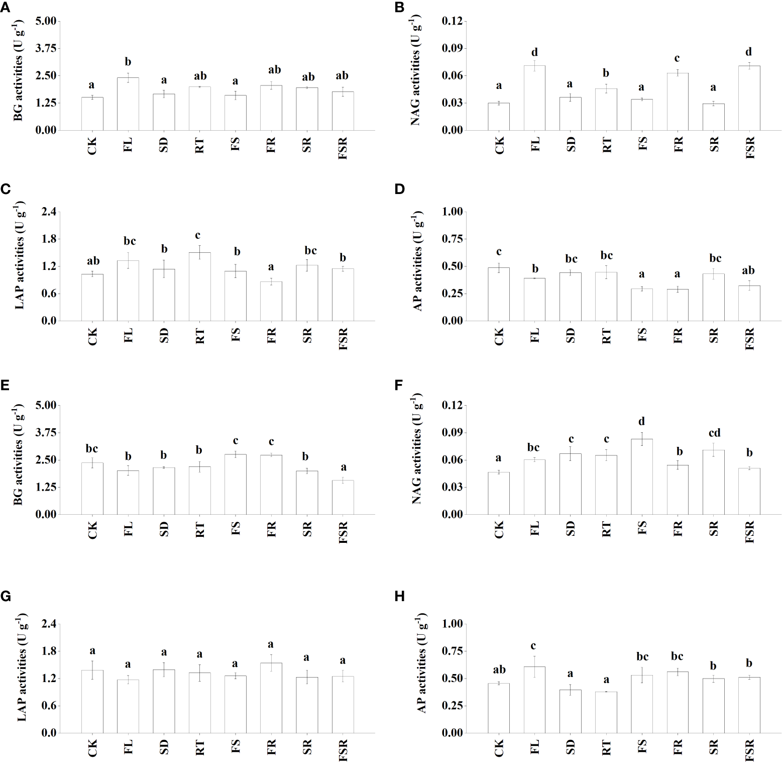 The responses of soil enzyme activities to the litter decomposition in Parakmeria nitida(A–D) and Dayaoshania cotinifolia(E–H) forests. Different letters above the bars represent significant differences from Duncan multiple comparisons among 8 litter treatments (P<0.05). CK, no litter decomposition; FL, the decomposition of fresh leaf litter; SD, the decomposition of semi-decomposed litter; RT, the decomposition of fine root; FS, the decomposition of fresh leaf litter + semi-decomposed litter; FR, the decomposition of fresh leaf litter + fine root; SR, the decomposition of semi-decomposed litter + fine root; FSR, the decomposition of fresh leaf litter + semi-decomposed litter + fine root; BG, β-glucosidase; NAG, N-acetyl-β-D-glucosaminidase; LAP, leucine aminopeptidase; AP, acid phospomonoesterase.