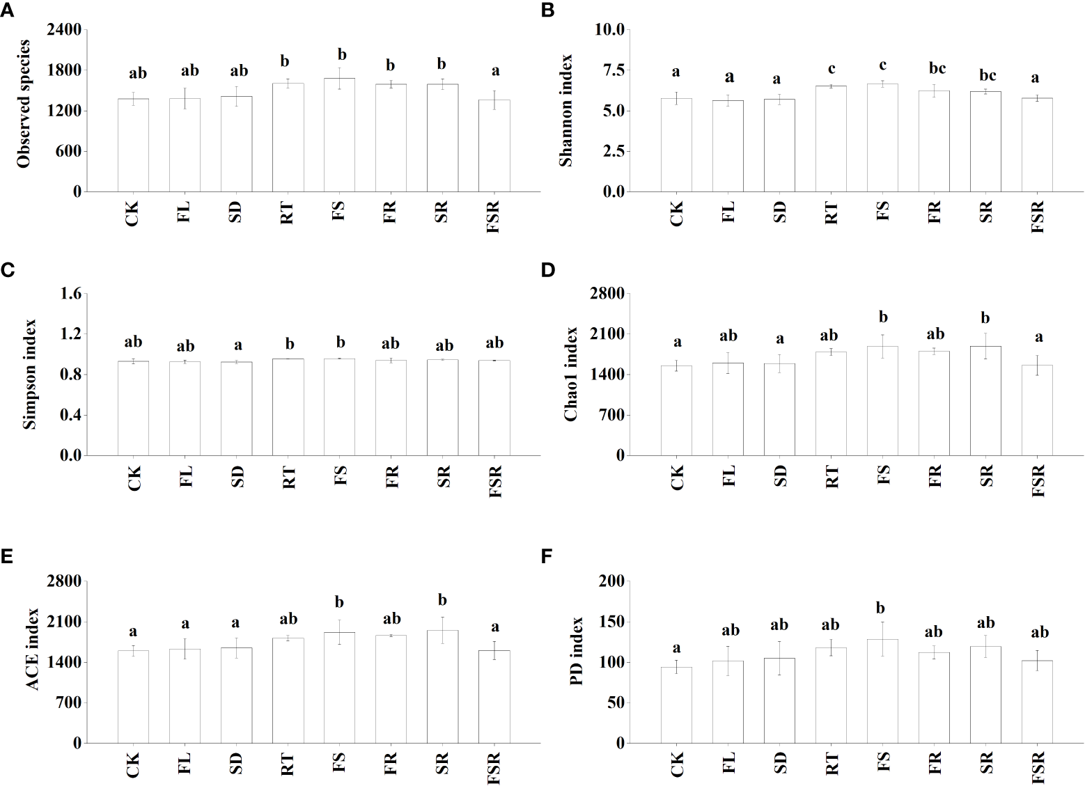 The responses of alpha diversity index of soil bacteria to the litter decomposition in Dayaoshania cotinifolia forest (A–F). Different letters above the bars represent significant differences from Duncan multiple comparisons among 8 litter treatments (P<0.05). CK, no litter decomposition; FL, the decomposition of fresh leaf litter; SD, the decomposition of semi-decomposed litter; RT, the decomposition of fine root; FS, the decomposition of fresh leaf litter + semi-decomposed litter; FR, the decomposition of fresh leaf litter + fine root; SR, the decomposition of semi-decomposed litter + fine root; FSR, the decomposition of fresh leaf litter + semi-decomposed litter + fine root.