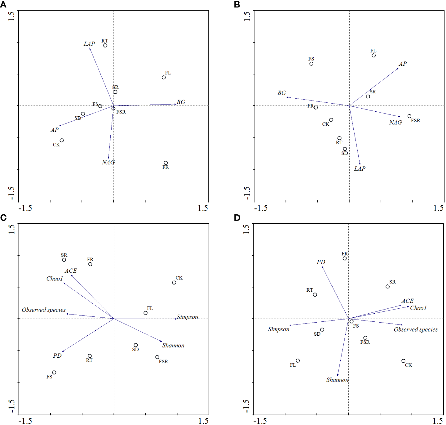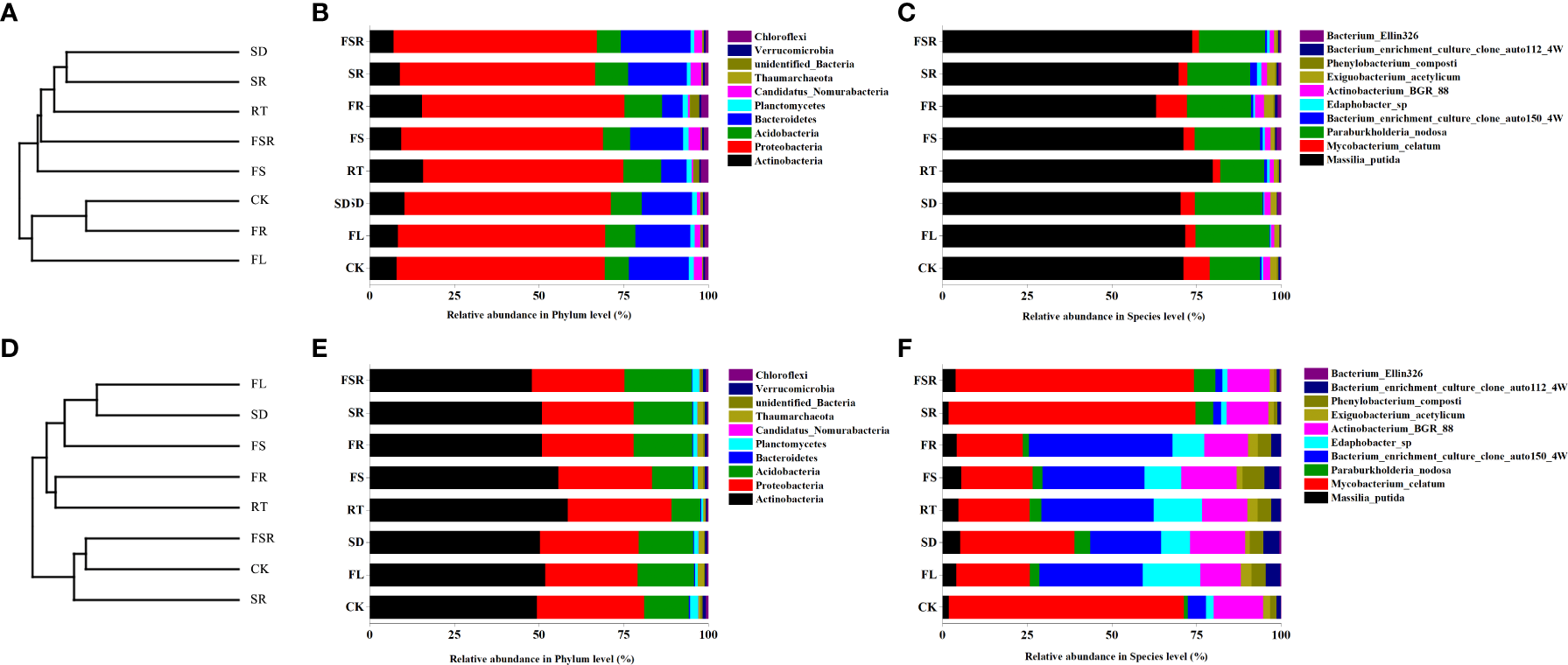 The Shannon index were significantly higher in the RT and FS treatments than that in the treatment of CK, FL, SD and FSR in the P. nitida forest (Figure 3B). The Simpson index was significantly higher in the RT and FS treatment than that in the SD treatment (Figure 3C). The indexes of Chao1, ACE and PD were significant higher in the FS treatment compared to that in the CK treatment (Figures 3D–F). In the D. cotinifolia forest, there were insignificant differences in the relative abundance of observed species, Chao1 index, ACE index and PD index between the control and litter treatments (Figures 4A, D–F). The Shannon index and Simpson index were significantly lower in the treatments of RT, FL and SR compared to that in the CK treatment (Figure 4B, C).