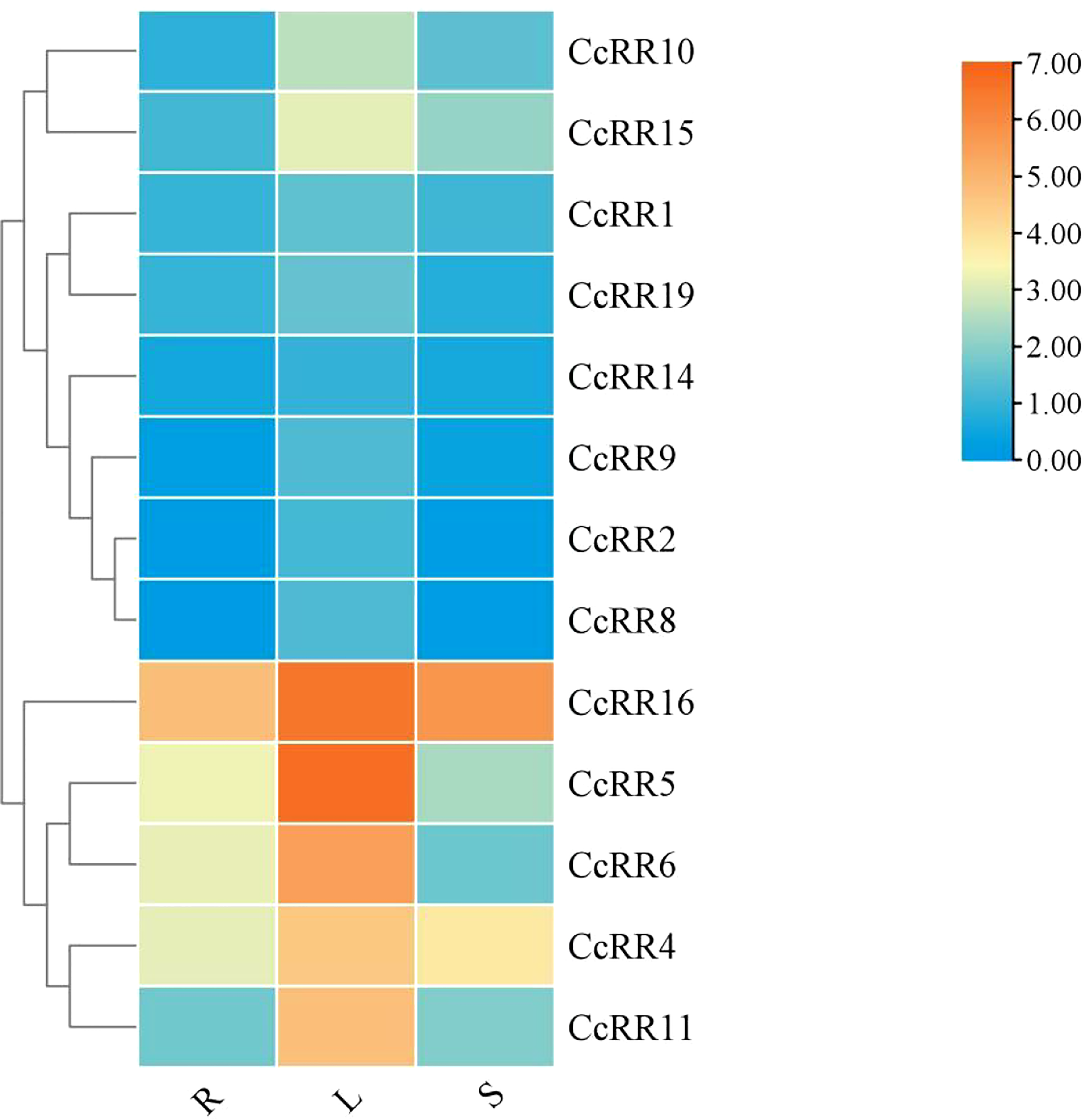 Heat-map of the expression profiles of CcRR genes in different tissues. R: root; L: leaf; S: stem. The vertical color scale shown to the right of the image represents log2 expression values.