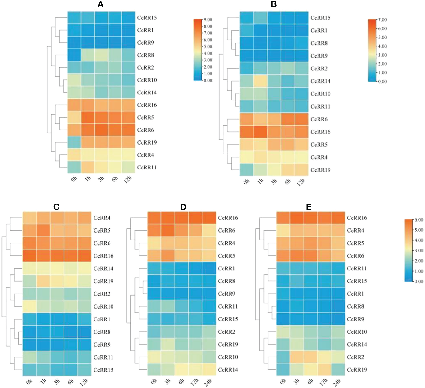 Heat-map of the expression pattern of CcRR genes in roots response to the treatments of hormone and abiotic stresses. (A) 6-BA treatment; (B) ABA treatment; (C) PEG treatment; (D) Cold treatment; (E) NaCl treatment. The figures (C-E) use the same ruler. The 0, 1, 3, 6, 12 and 24 h labels indicate the time after treatment. The vertical color scales shown to the right of the image represent log2 expression values.