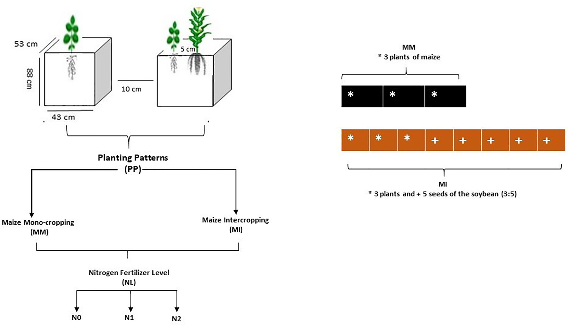 Maize (Qing Qing 700 variety) was planted as a mono-crop (MM) and an intercrop (MI) with soybean (Gui Chun 15 variety) in large-sized pots (i.e., 88 cm height, 53 cm width, and 43 cm length) filled with 120 kg of soil. The pots, in four replicates, were randomly placed in a ventilated net house under natural light. Initially, five maize seeds and ten soybean seeds were planted in mono-cropping and intercropping at a plant density of 60,000 maize plants ha-1 and soybean seed rate of 20 kg seeds ha-1, respectively. However, later at the V3 growth stage, the maize and soybean plants were reduced to 3 and 5 (3:5) plants per pot, respectively, by uprooting the extra plants to better adapt to the pot environment (Figure 1). For the intercropping, maize and soybean plants were planted in the same pot such that the plant-to-plant and pot-to-pot distances were 5 and 10 cm, respectively. Additionally, the bottom of each pot was covered with small marble pebbles to minimize nutrient leaching. Planting and harvesting were done in mid-September 2021 and mid-February 2022, respectively for the first crop growing cycle, whereas the respective timings for the second cycle were mid-May 2022, and mid-October 2022.