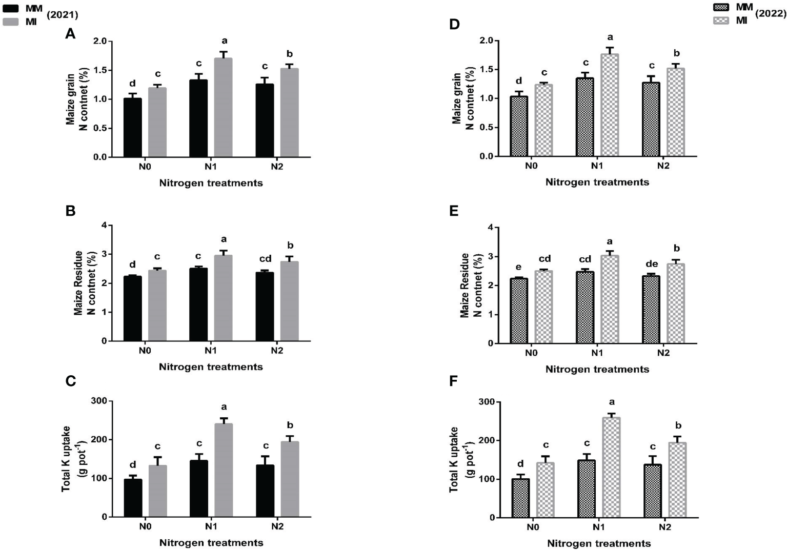 Maize grain N content (A, D), residue N content (B, E); total N uptake (C, F) under different planting patterns (MM, maize mono-cropping and MI, maize intercropping) and N fertilizer application rates (N0; 0 kg N ha-1, N1; 250 kg N ha-1 and N2; 300 kg N ha-1) in 2021 and 2022 crop growing seasons. The column bars with dissimilar lowercase letters are significantly different from each other as per the LSD test (p< 0.05).