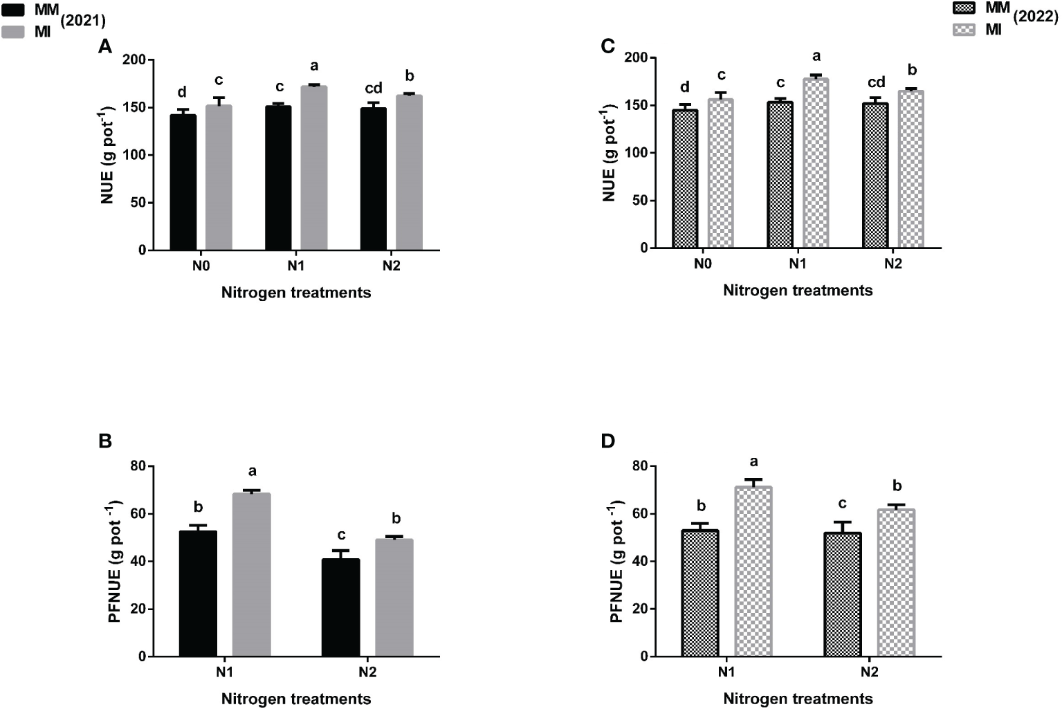 Maize nitrogen use efficiency (NUE) (A, C), partial factor nitrogen use efficiency (PFNUE) (B, D) under different planting patterns (MM, maize mono-cropping and MI, maize intercropping) and N fertilizer application rates (N0; 0 kg N ha-1, N1; 250 kg N ha-1 and N2; 300 kg N ha-1) in 2021 and 2022 crop growing seasons. The column bars with dissimilar lowercase letters are significantly different from each other as per the LSD test (p< 0.05).
