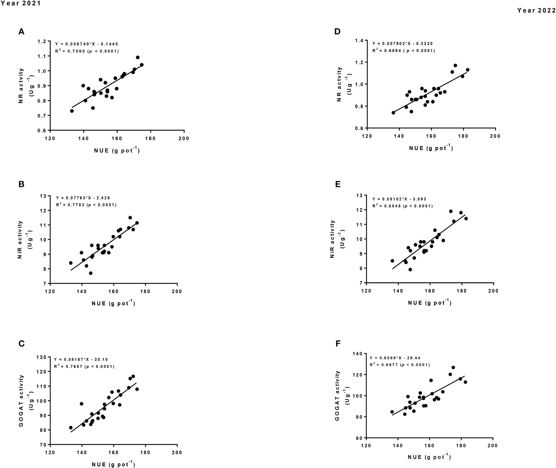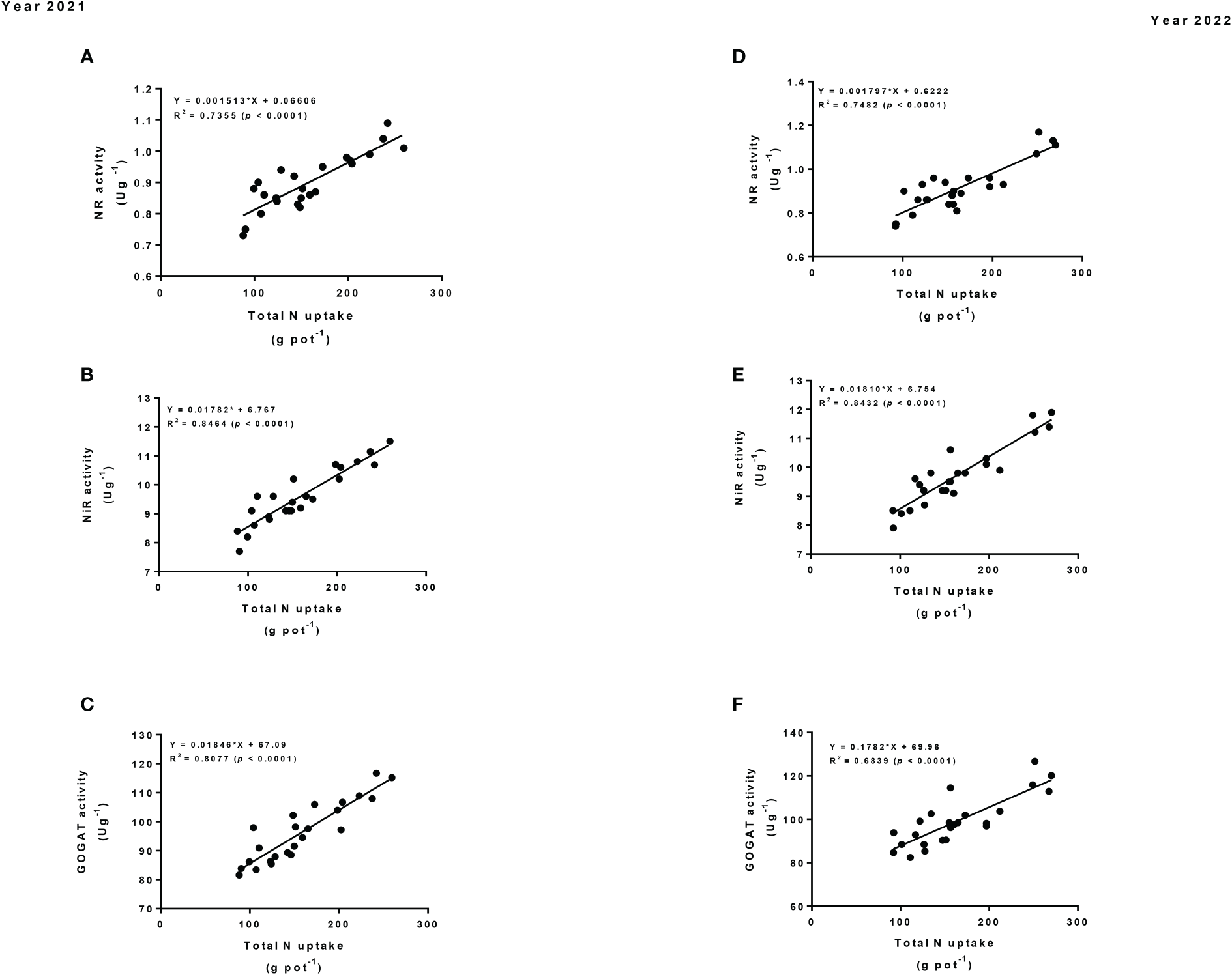 The linear regression analysis was used to determine the relationship of the total N uptake and NUE with the N assimilatory enzymes (i.e., NR, NiR and GOGAT activity) of maize crop. The result showed that the total N uptake had significant strong correlations with NR, NiR and GOGAT activity (Figures 7A–F). Equally, NUE had significant positive and strong correlations with NR, NiR and GOGAT activity (Figures 8A–F). Thus, such relationships suggested that changes in the N assimilatory enzymes could significantly bring changes in the total N uptake and NUE of the maize crop under intercropping.