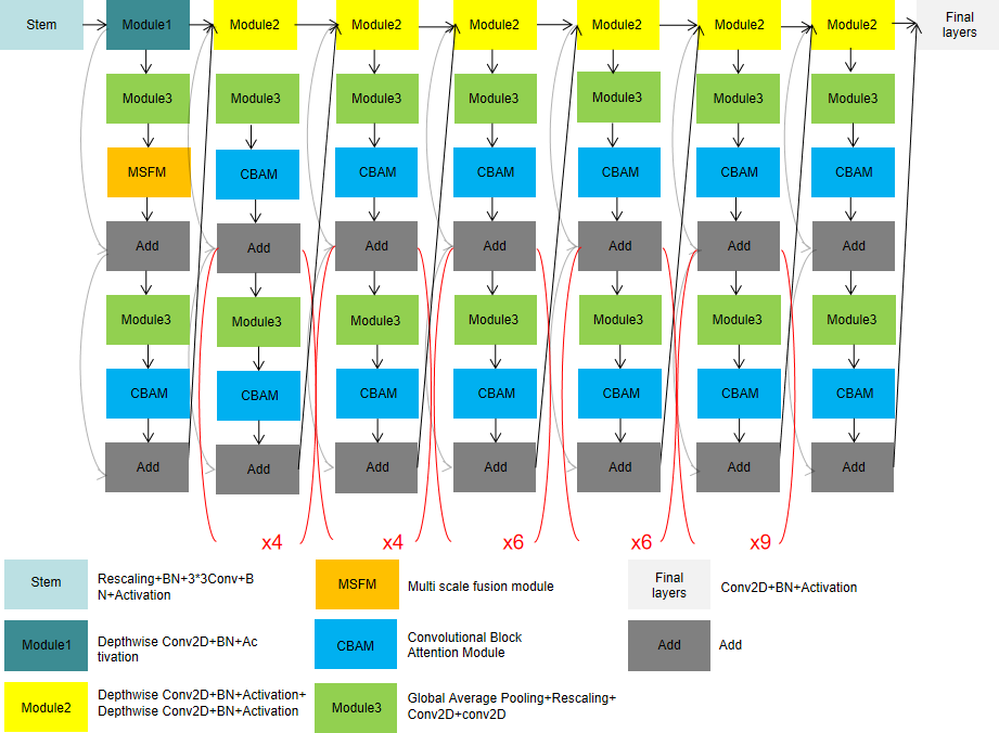 The key features in the map can be selectively enhanced and the features can be accurately located by redistributing both channel and spatial weights through the Attention Mechanism. Compared with the previous EfficientNet model, which did not include the MSFM module, the new model adds modules based on the attention mechanism to allocate computing resources to more important tasks. The operations of different pooling layers in channel and space were added to enhance important features and reduce the proportion of unnecessary features. At the same time, the sensitivity field of the low-level feature map augmented by expansion convolution with different expansion rates can not only extract the details of color and texture, but also fully obtain the context information of the image. In the end, the feature map output obtained by different expansion rates is fused to improve the classification effect.