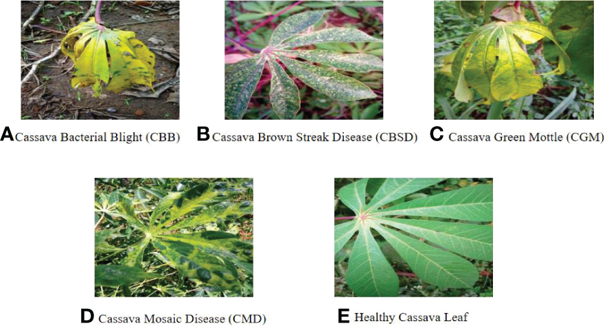 Images of cassava leaf diseases (A–D is the disease of four different cassava leaves and e is the healthy leaf).
